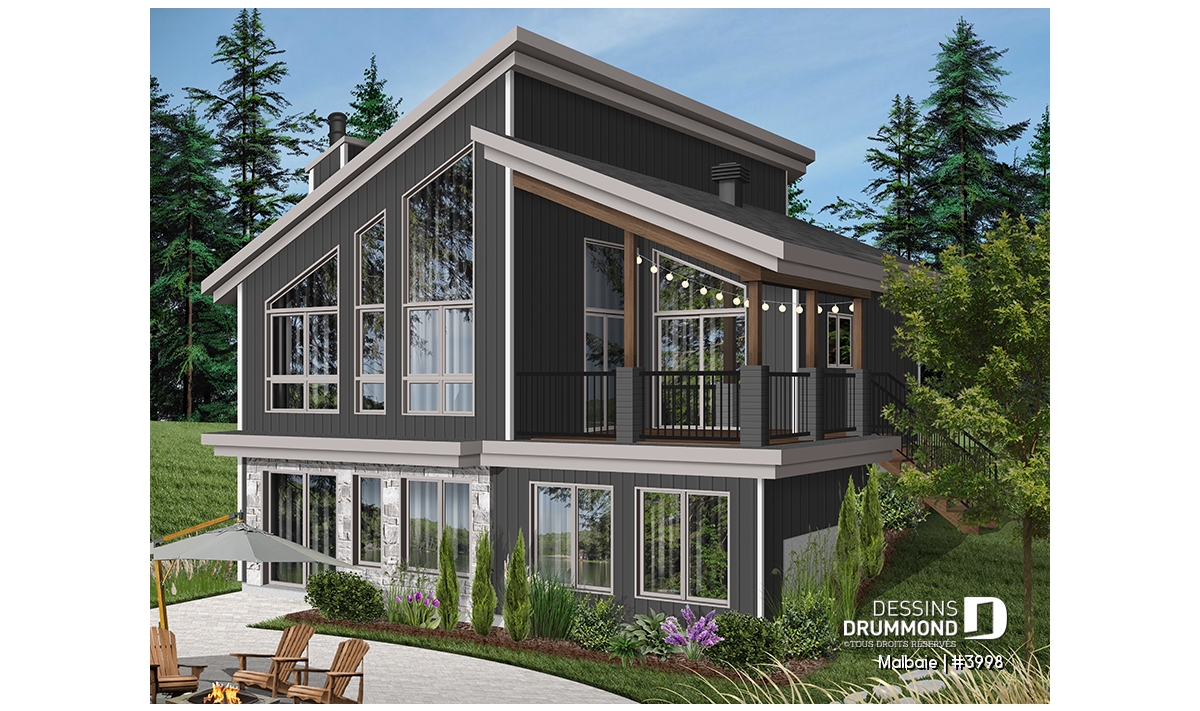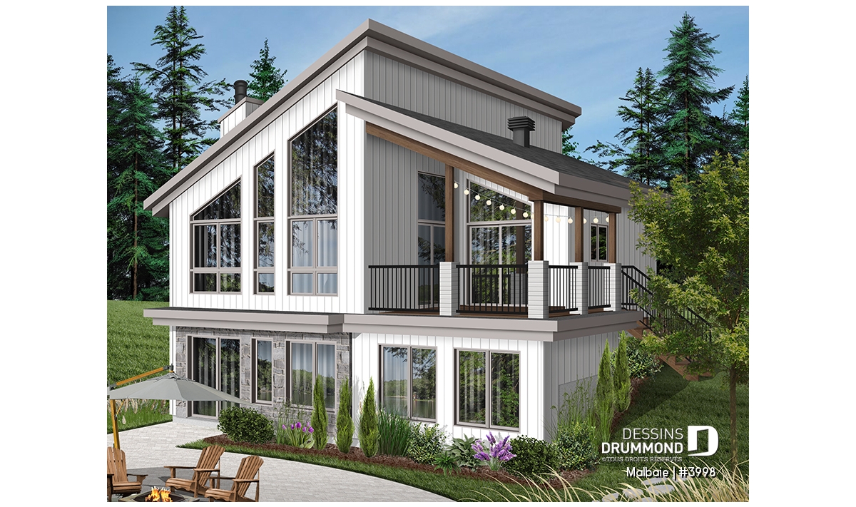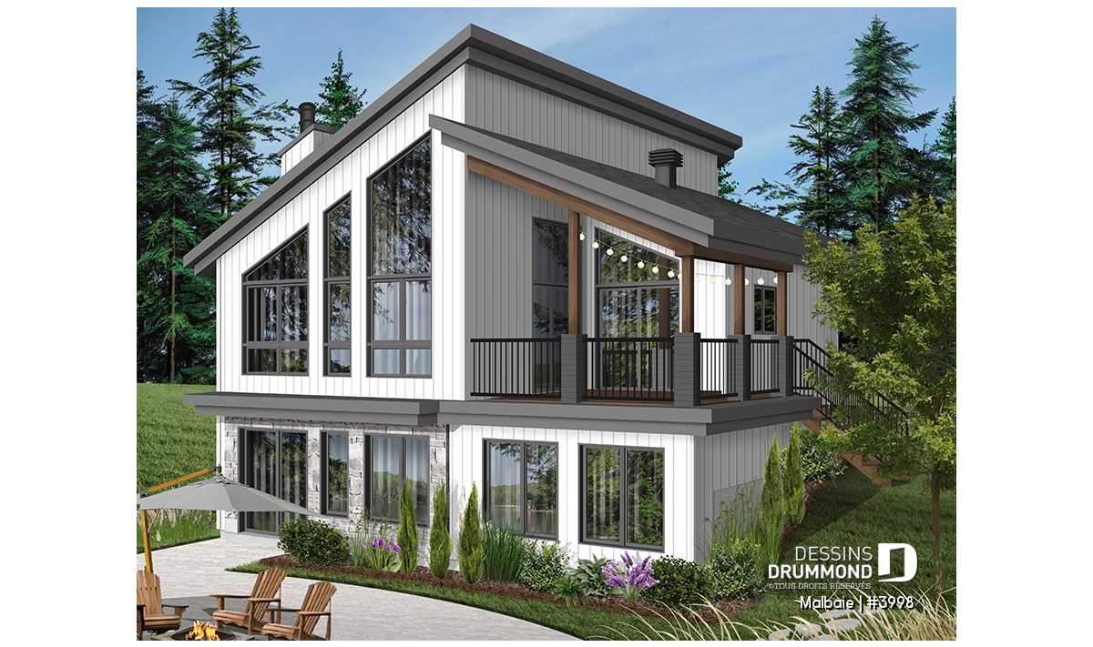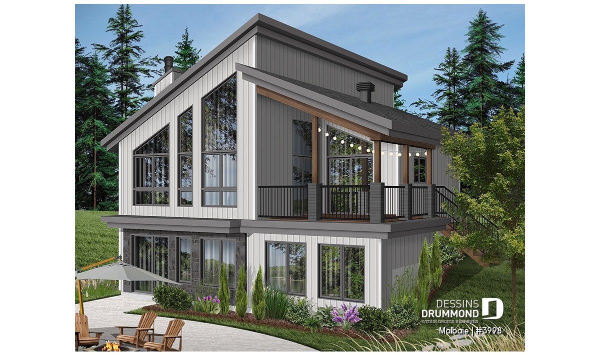Superbe chalet tout en lumière au rez-de-chaussée proposant un plafond cathédral, deux portes-patios, un plancher à aire ouverte et une grande terrasse extérieure abritée. D’allure en bois rustique, le nouveau plan de chalet # 3998 de Dessins Drummond, aussi nommé Malbaie, s’intègre parfaitement à tout terrain en nature et à la campagne.