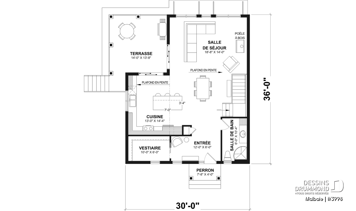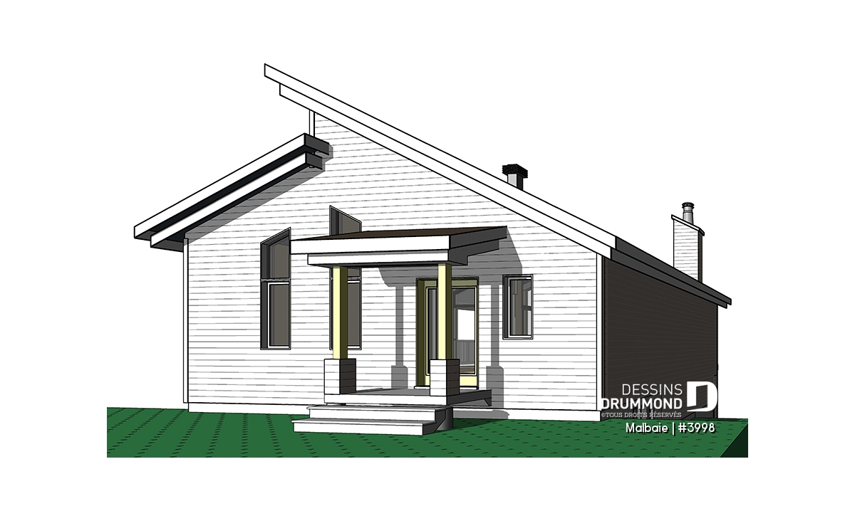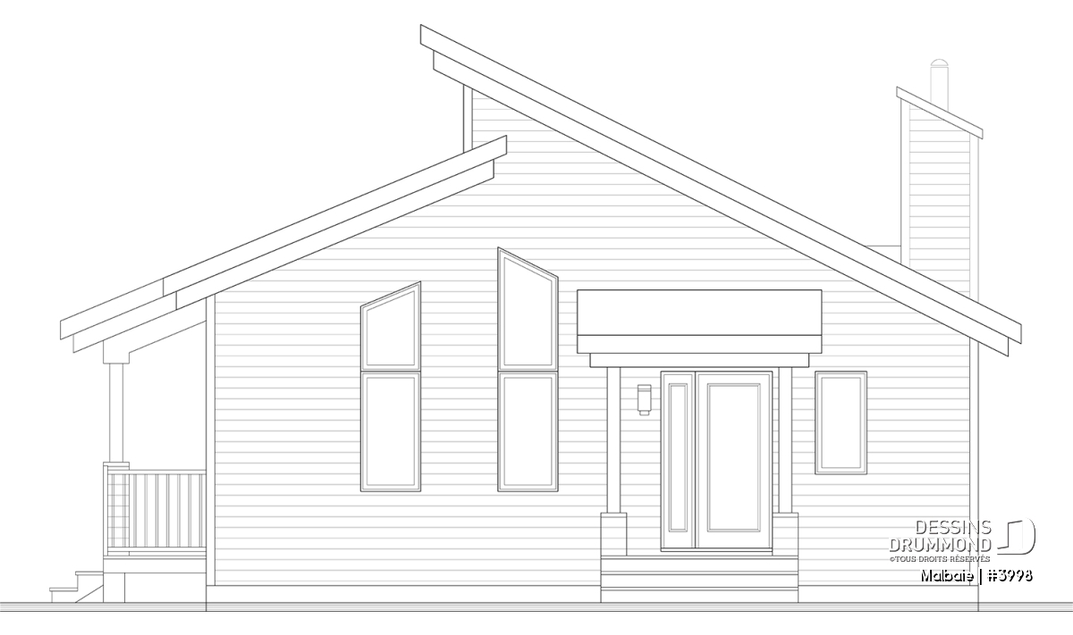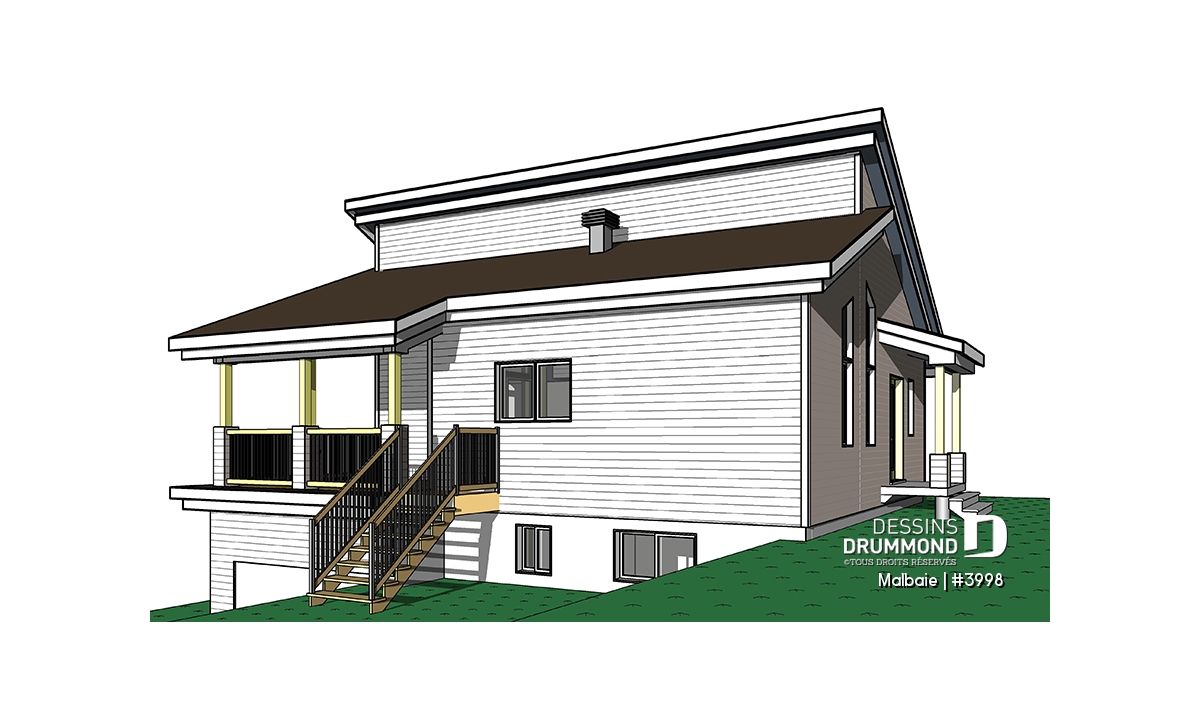 Superbe chalet tout en lumière au rez-de-chaussée proposant un plafond cathédral, deux portes-patios, un plancher à aire ouverte et une grande terrasse extérieure abritée. D’allure en bois rustique, le nouveau plan de chalet # 3998 de Dessins Drummond, aussi nommé Malbaie, s’intègre parfaitement à tout terrain en nature et à la campagne.