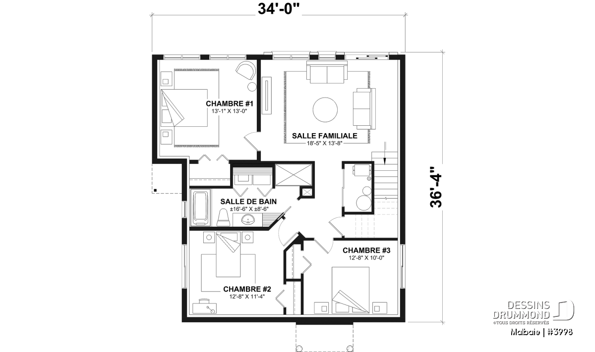 Au sous-sol de ce plan de chalet en rez-de-jardin, vous retrouvez 3 grandes chambres à coucher, une grande salle de bain proposant bain et douche séparés ainsi qu’un coin laveuse/sécheuse, et un rangement.