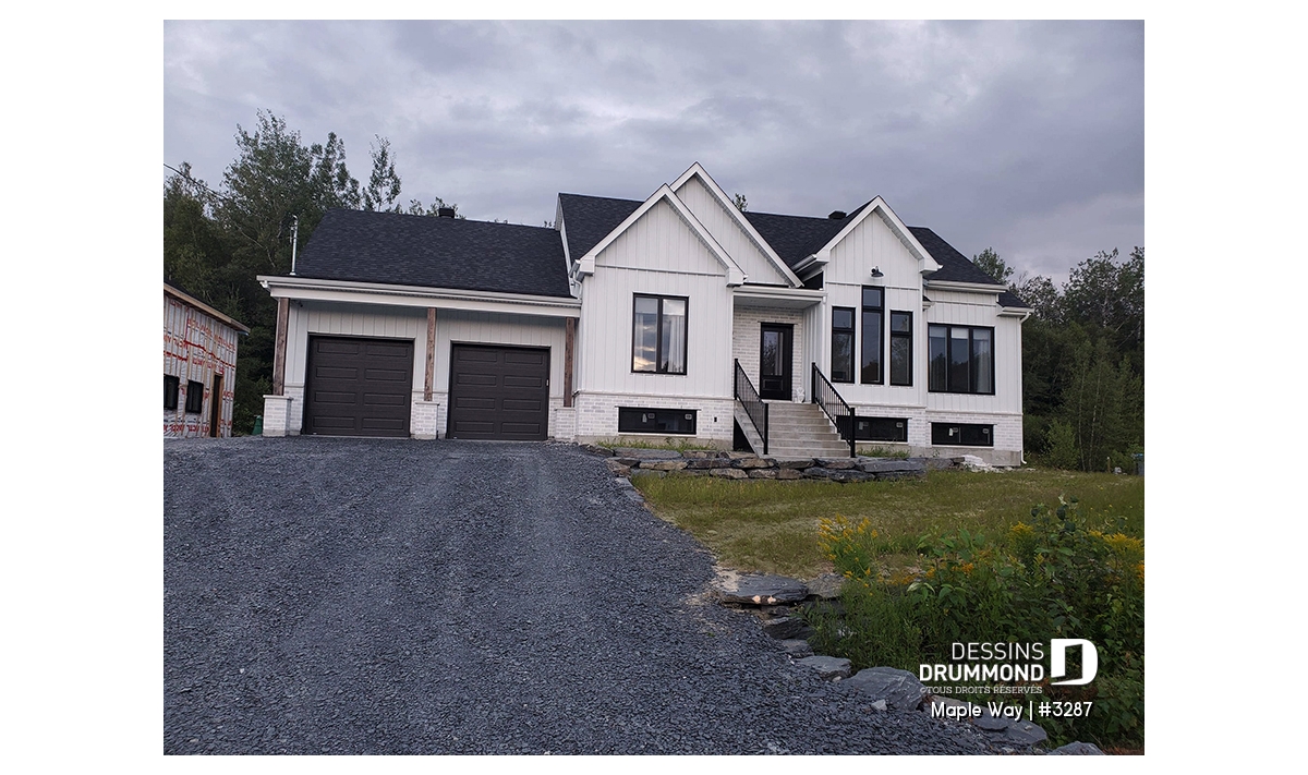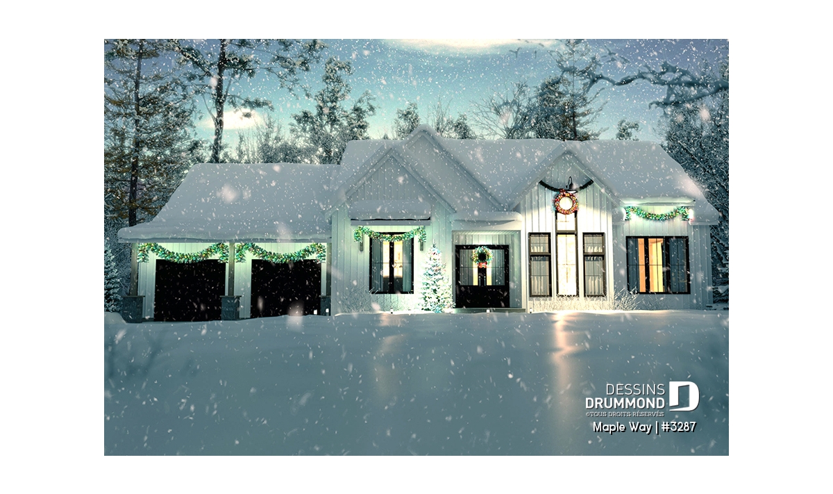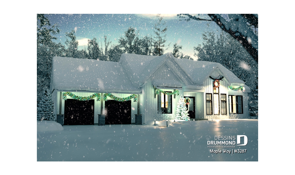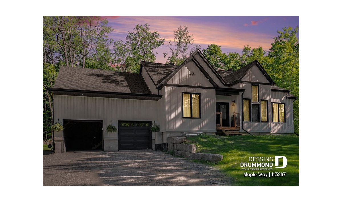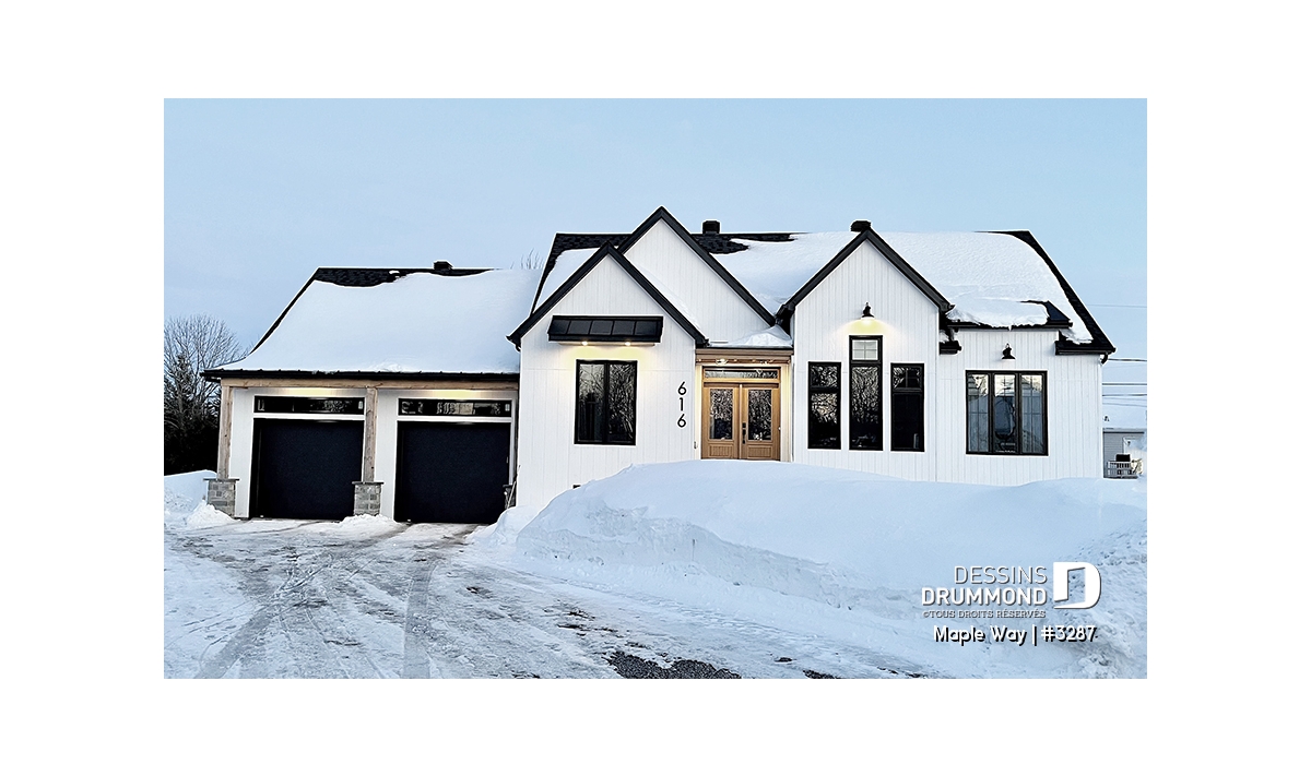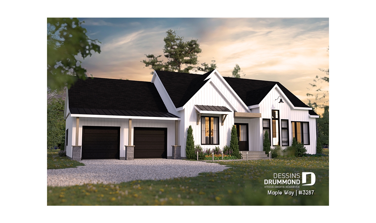 Le plan de maison de plain-pied Maple Way (plan #3287) propose un plancher de 1788 pi.carré, un garage double ainsi qu'une grande terrasse abritée.