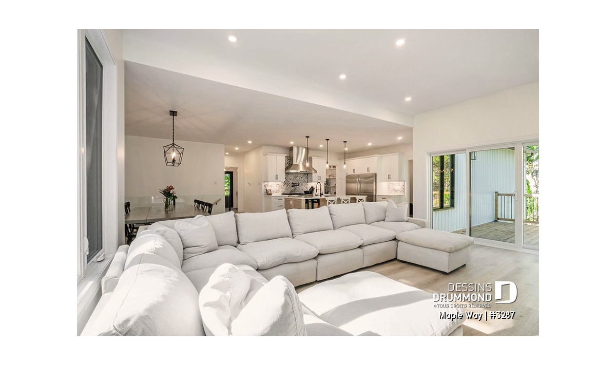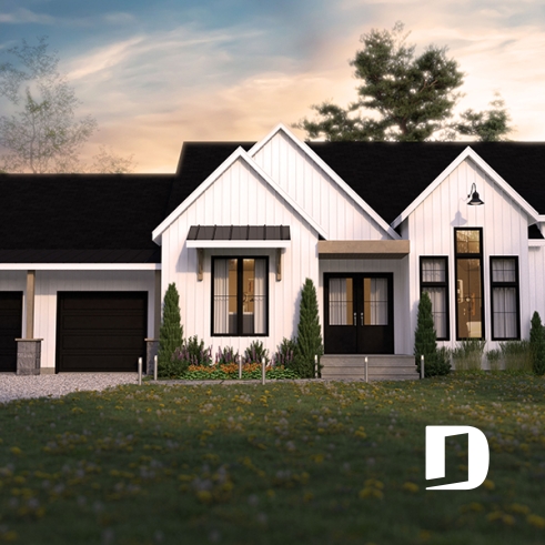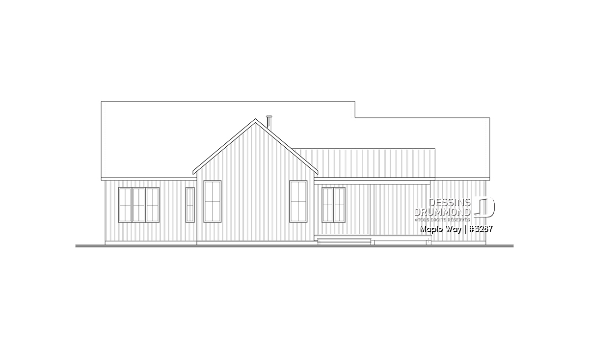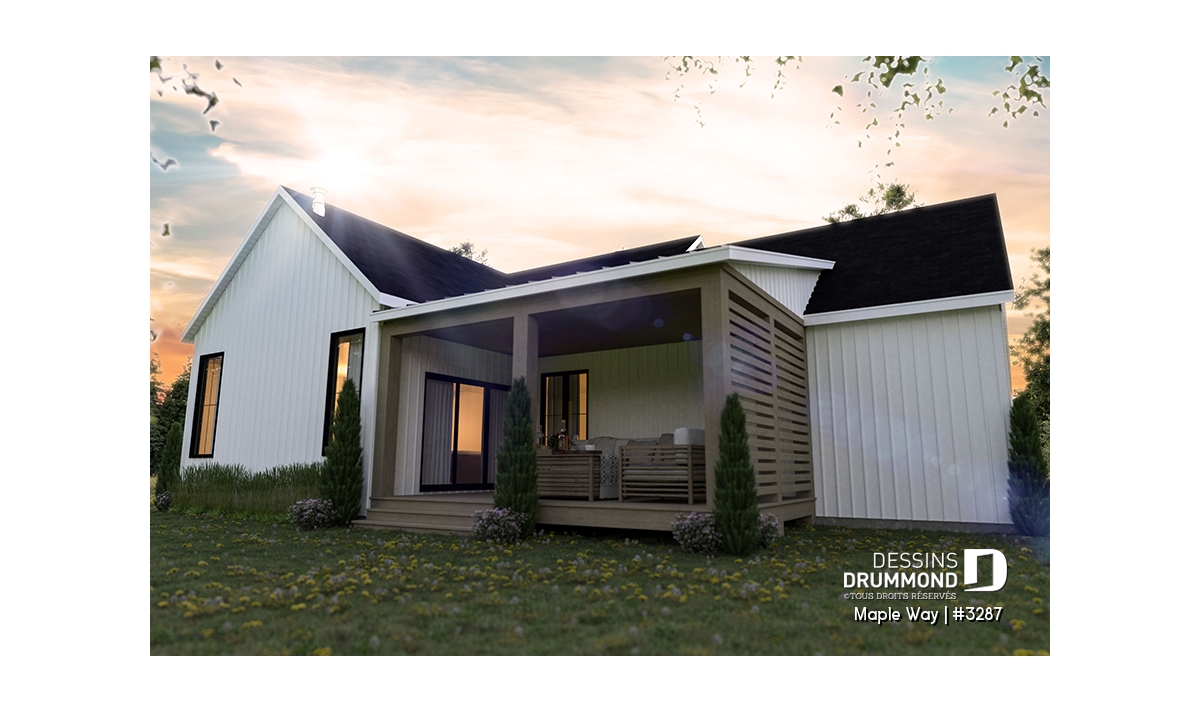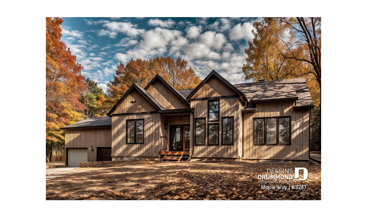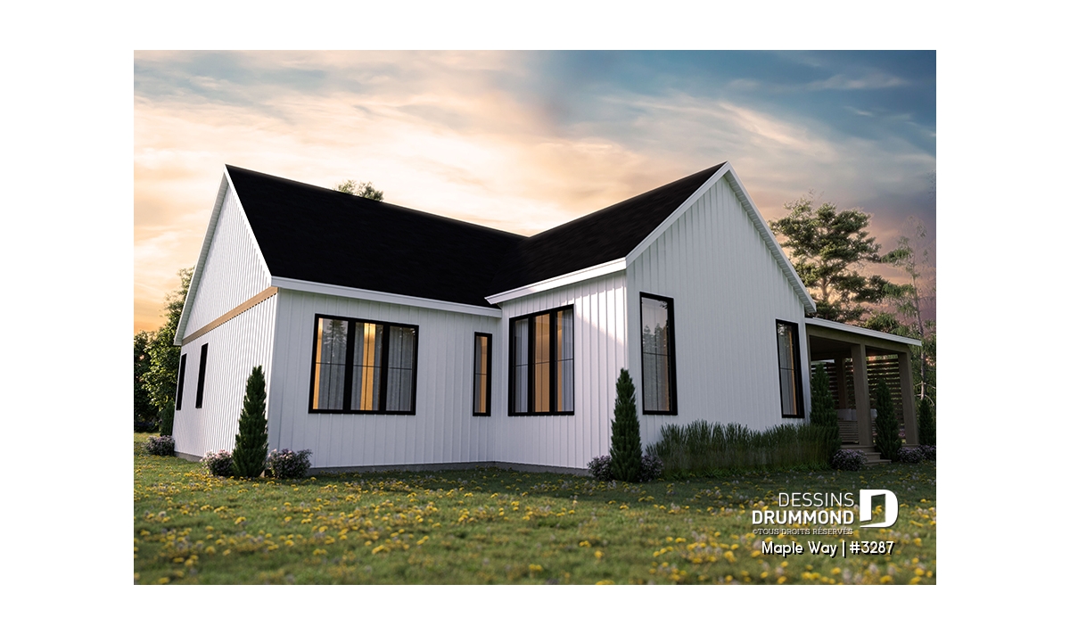 Le plan de maison de plain-pied Maple Way (plan #3287) propose un plancher de 1788 pi.carré, un garage double ainsi qu'une grande terrasse abritée.