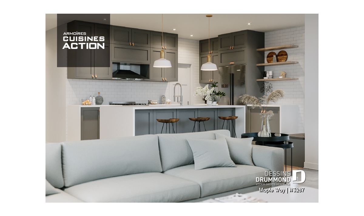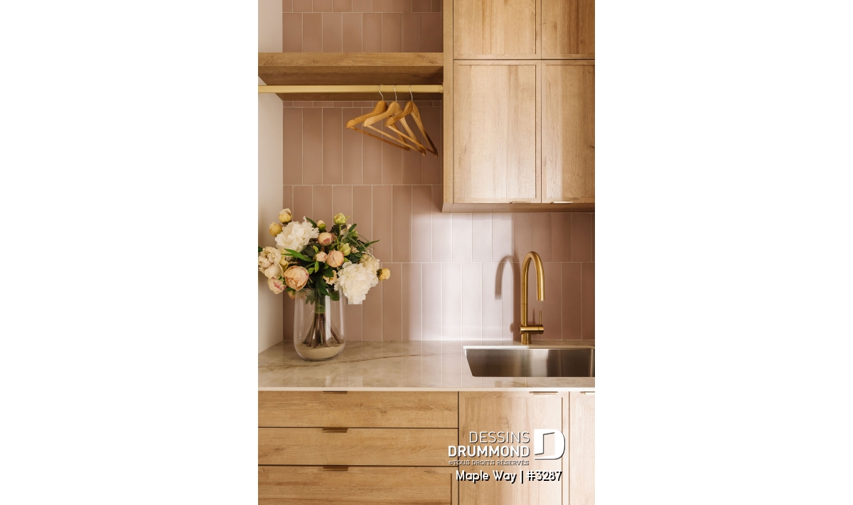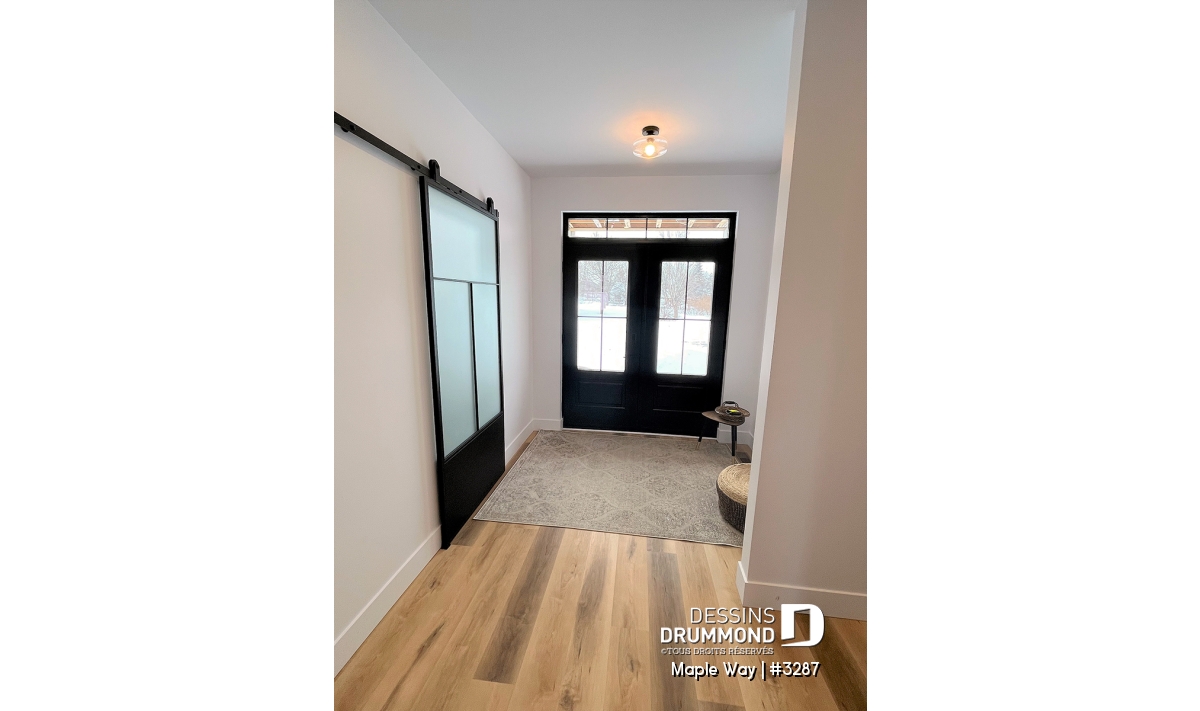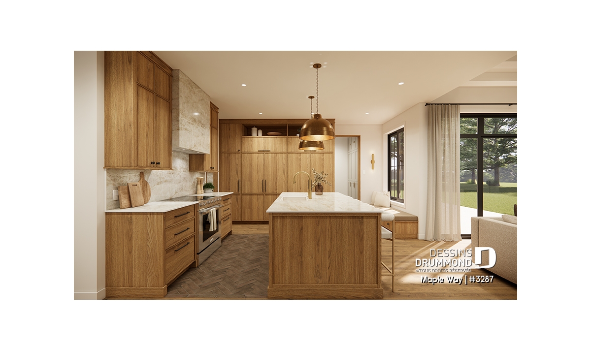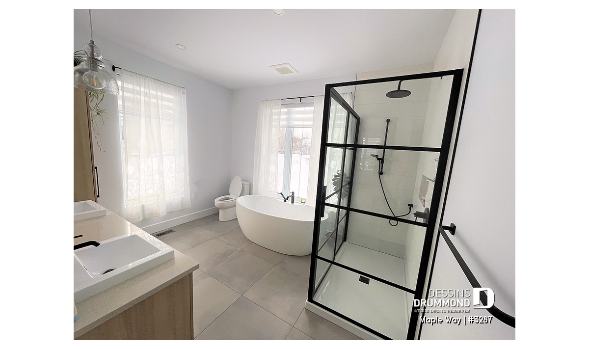 Le plan de maison de plain-pied Maple Way (plan #3287) propose un plancher de 1788 pi.carré, un garage double ainsi qu'une grande terrasse abritée.