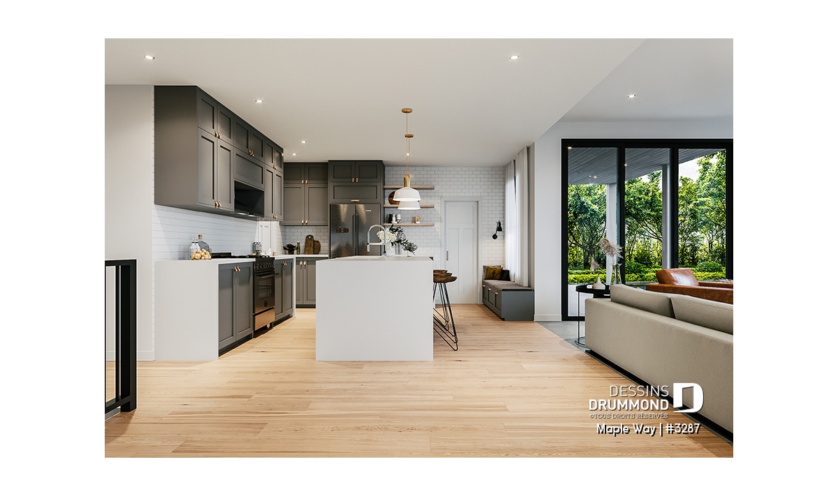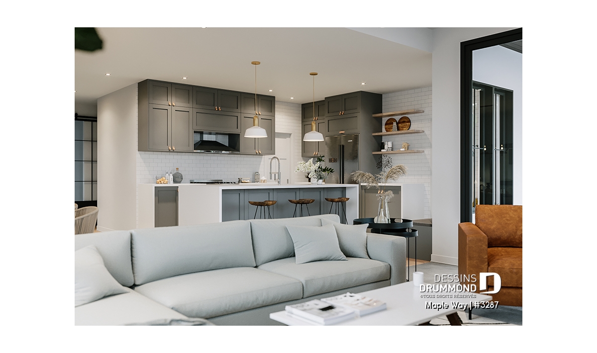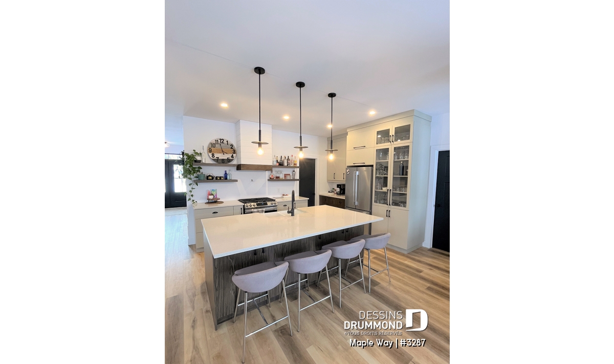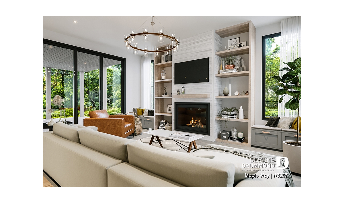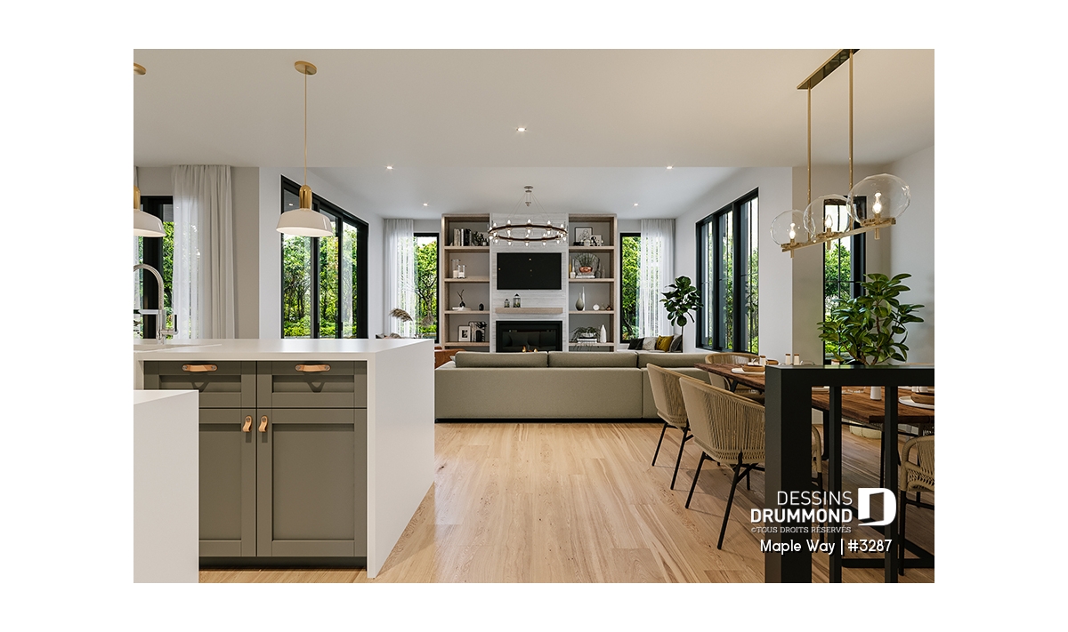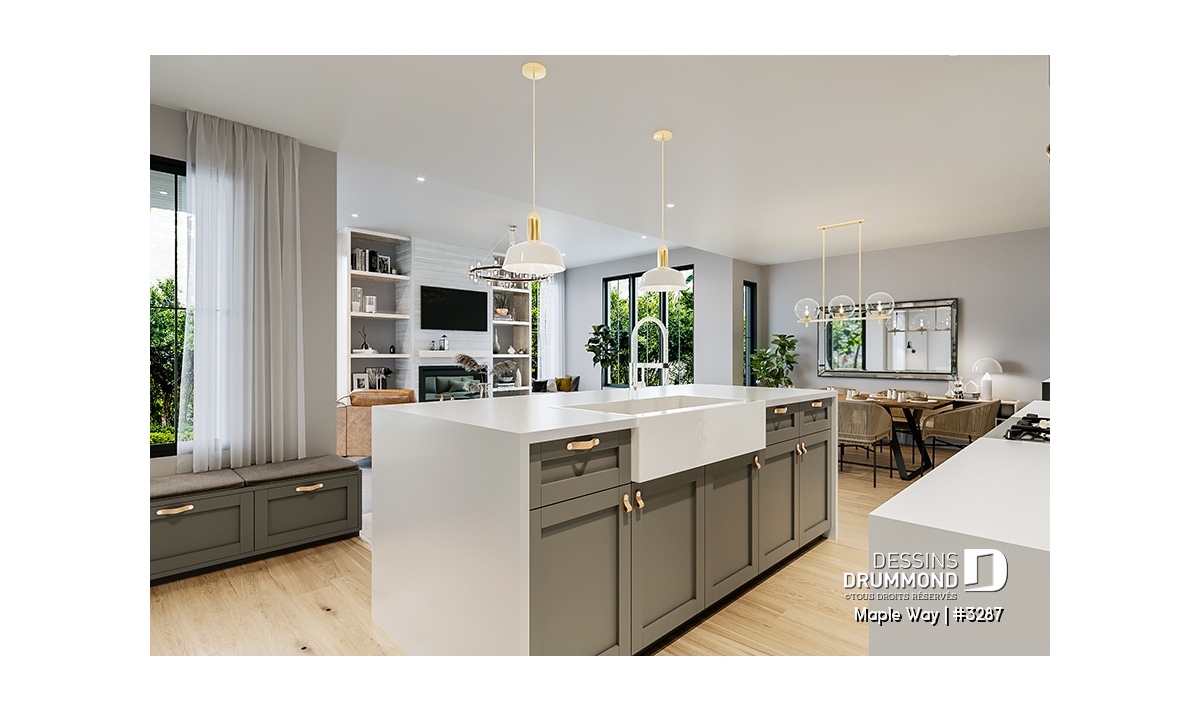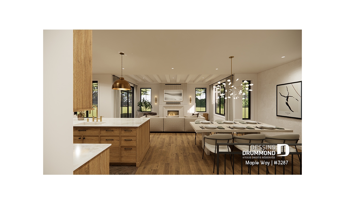 La cuisine a un îlot de grand format, un garde-manger, un banc et est ouverte sur la salle à manger et sur le salon. Le salon a un plafond de 10' de hauteur et on y retrouve aussi 2 bancs de type banquette, des tablettes aménagées de chaque côté du foyer ainsi qu'un accès à la grande terrasse abritée.