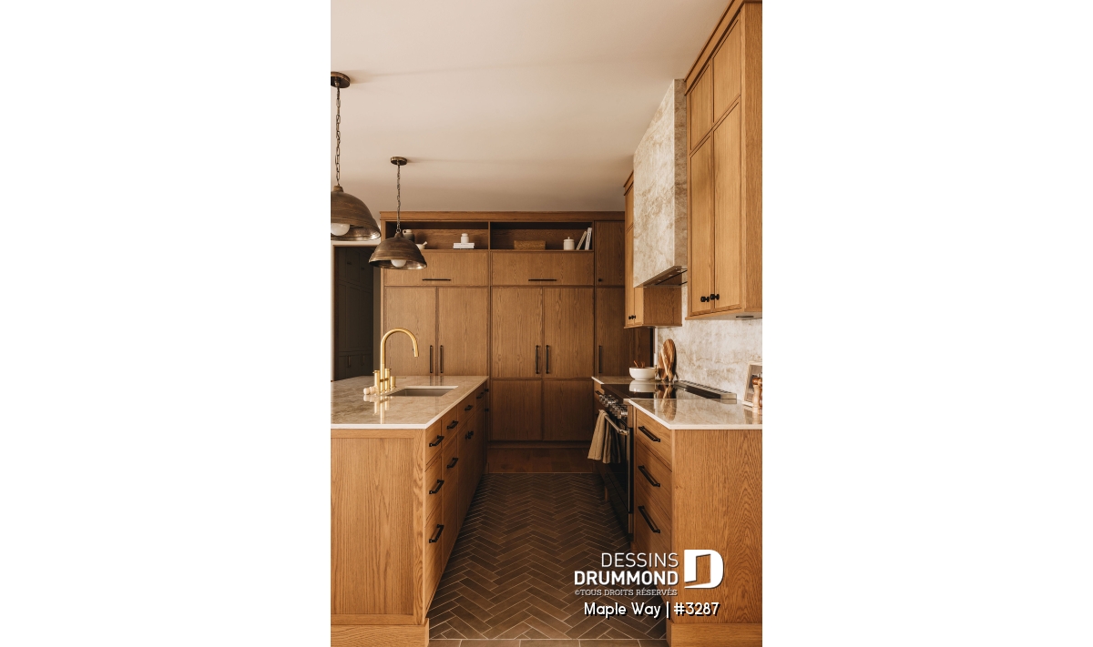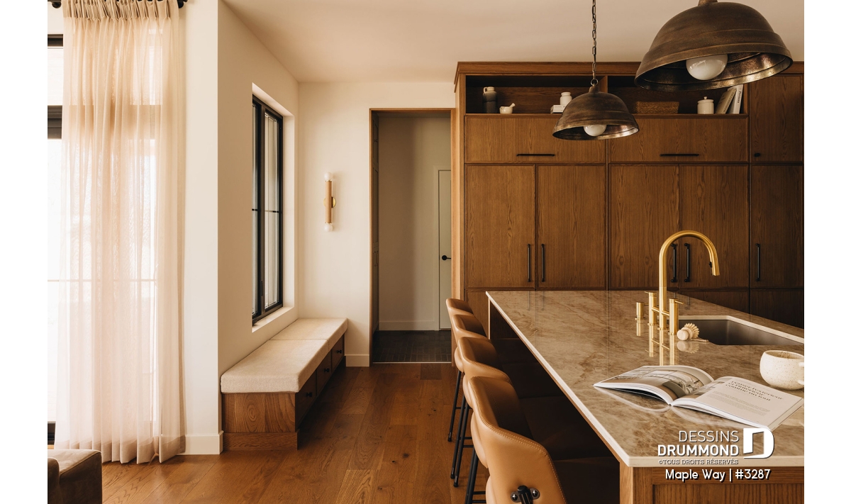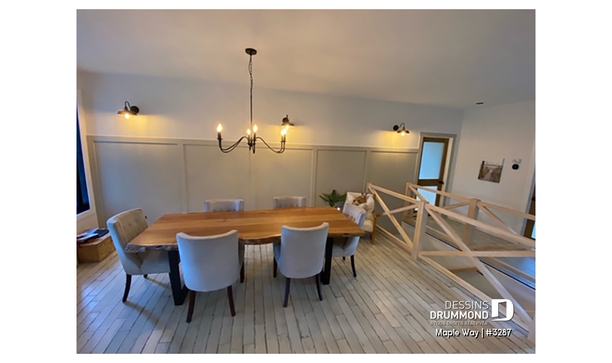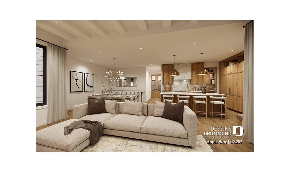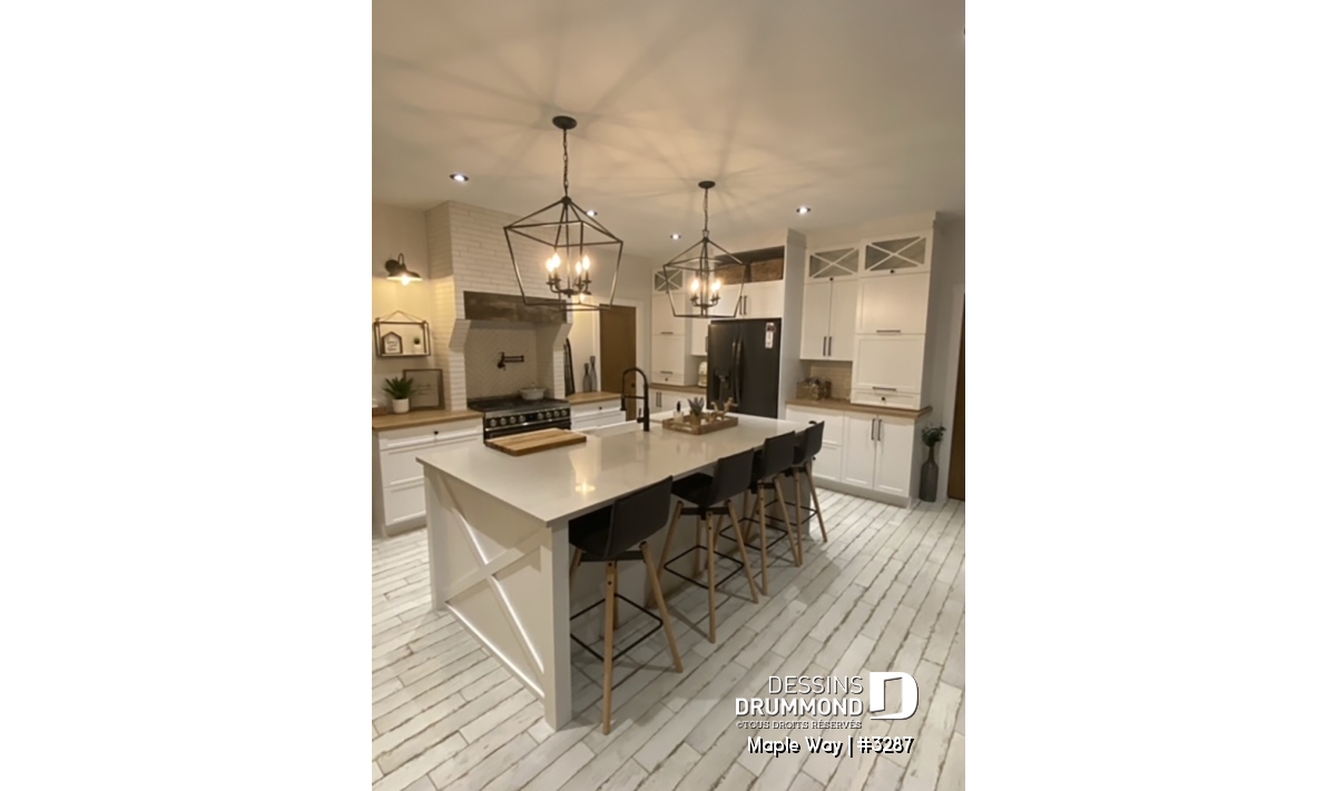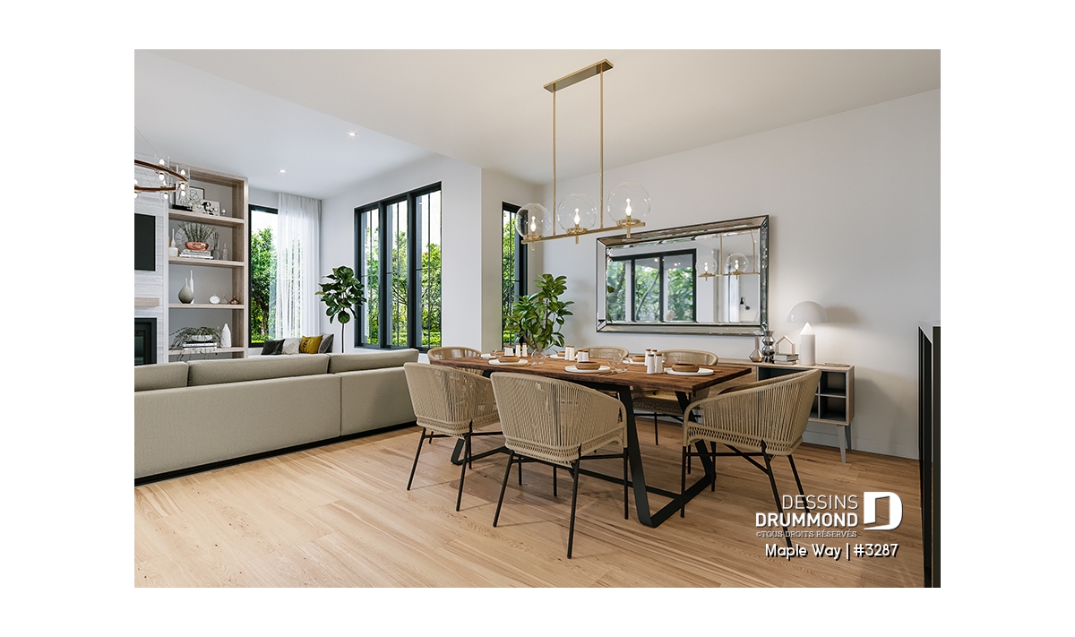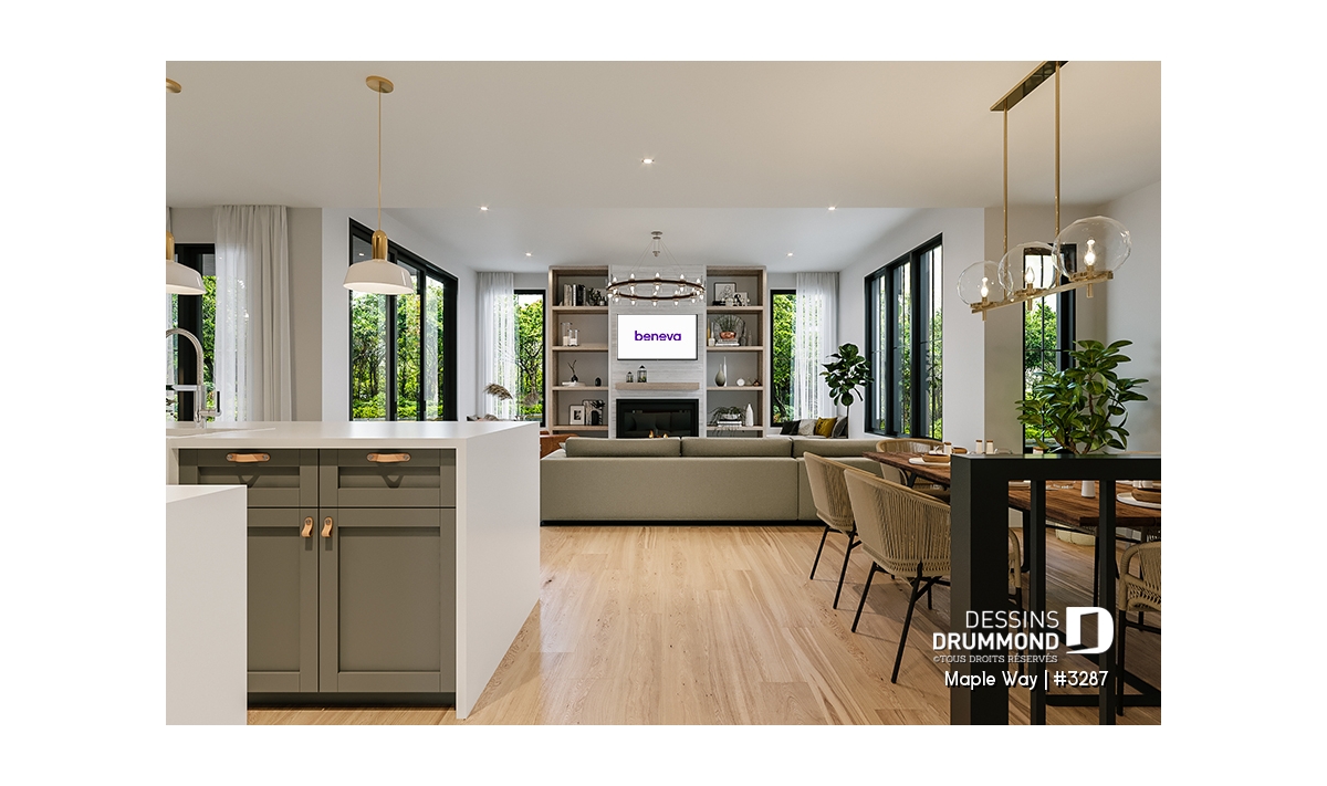 La cuisine a un îlot de grand format, un garde-manger, un banc et est ouverte sur la salle à manger et sur le salon. Le salon a un plafond de 10' de hauteur et on y retrouve aussi 2 bancs de type banquette, des tablettes aménagées de chaque côté du foyer ainsi qu'un accès à la grande terrasse abritée.