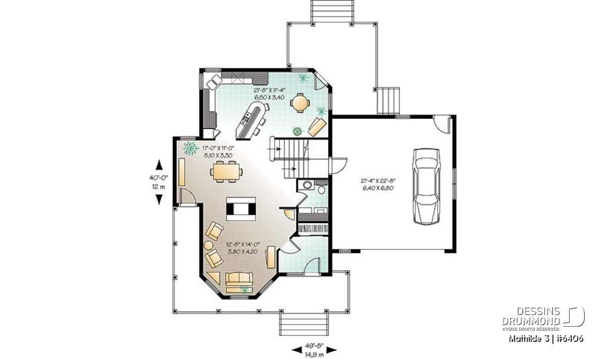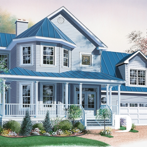 Ici, rien n’échappe au concepteur. Une grande galerie, liant la façade avant à la façade gauche, assure un accès couvert à la porte principale et à la porte secondaire donnant sur la salle à manger alors qu’un volume à angle, en saillie et sur deux étages, procure charme et lumière tant à la salle de séjour qu’à la chambre des maîtres. Un garage, suffisamment imposant et abaissé comme recherché dans les nouveaux quartiers résidentiels, propose un espace boni fort attrayant au-dessus et que bien des propriétaires apprécieront aménager à leur guise.