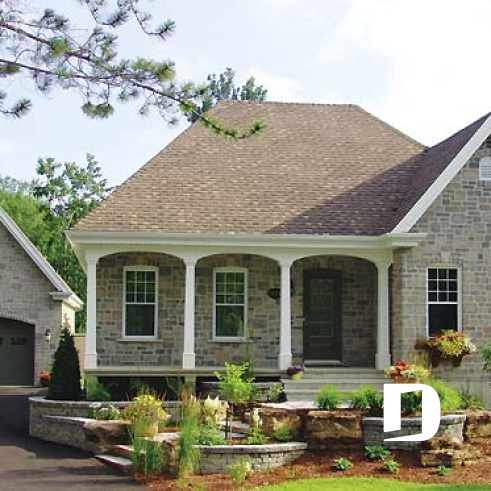 Galerie abritée à l'avant, boîte à fleurs à l'arrière, trellis de bois et moulures décoratif, jeux de volume au plafond du garage, volets en façade, fenestration abondante, garage a un espace à l'étage de 231 p.c. (24.84 m.c.)