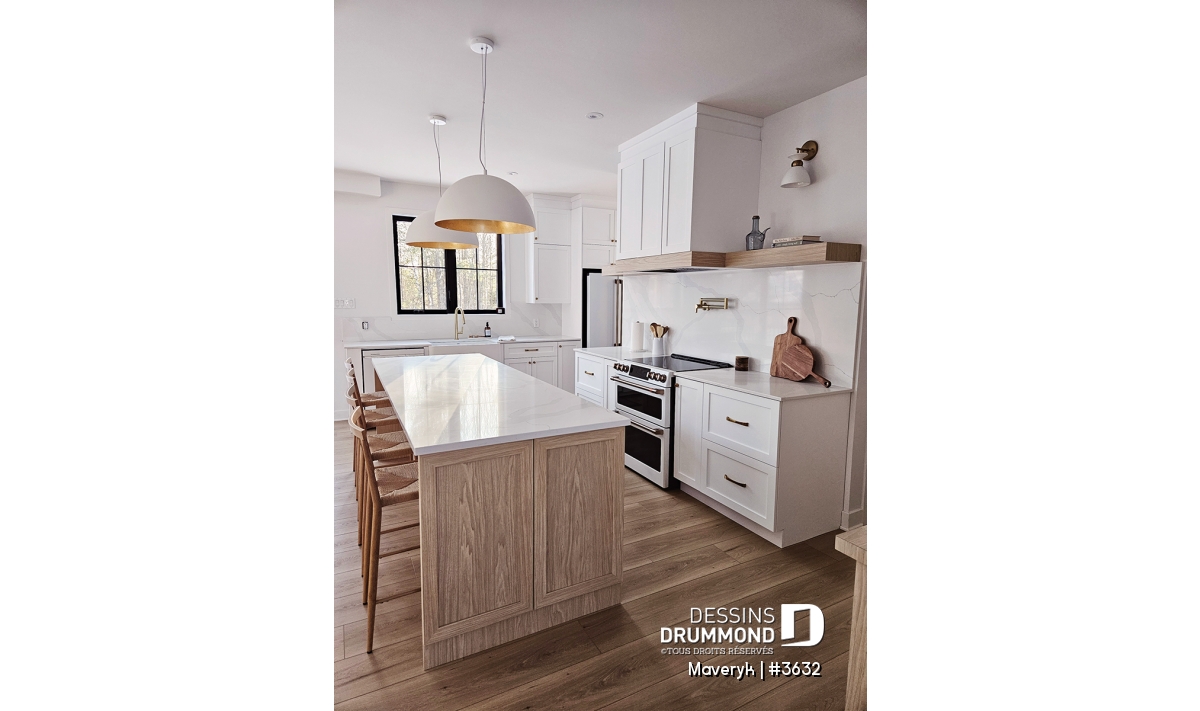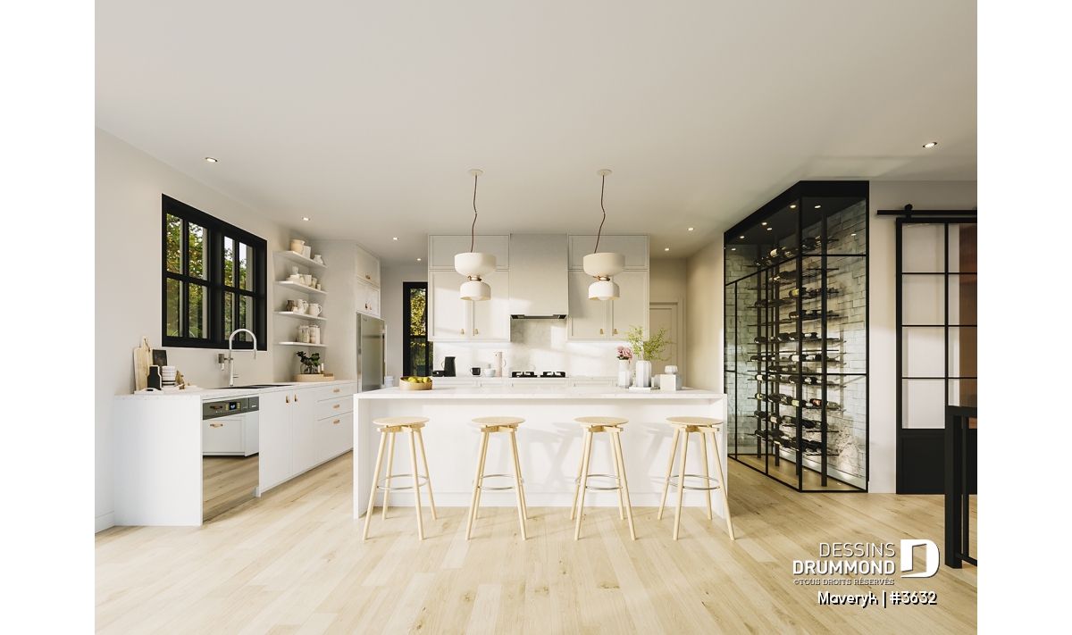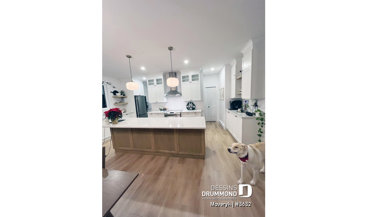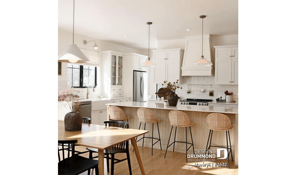 Cuisine avec grand îlot, garde-manger et ouverte sur la salle à manger.