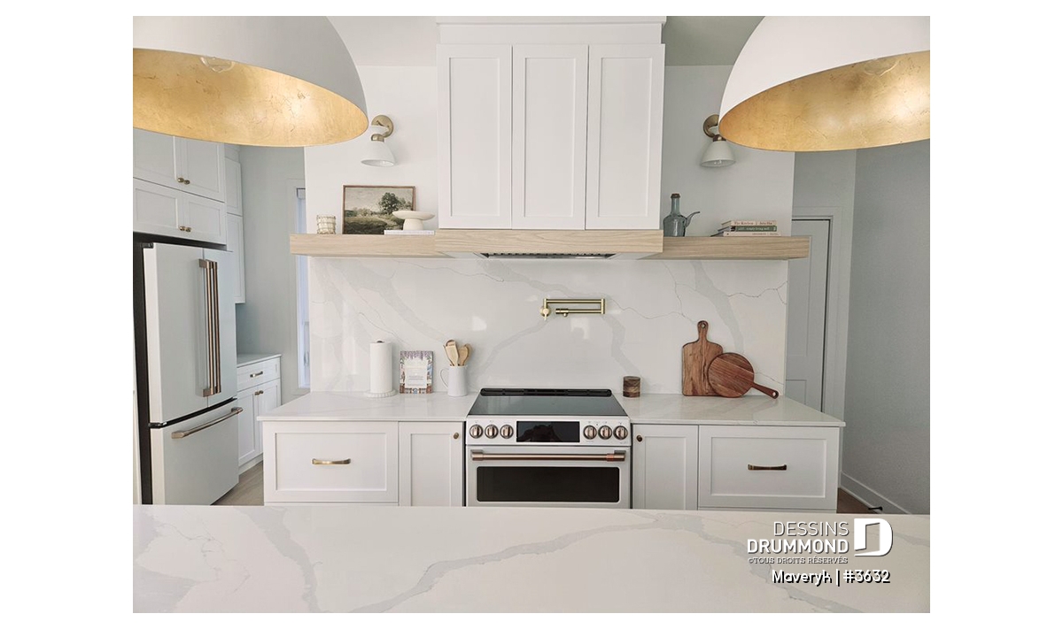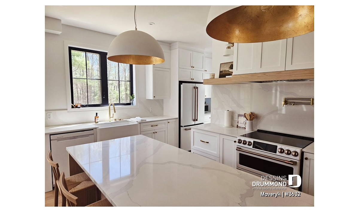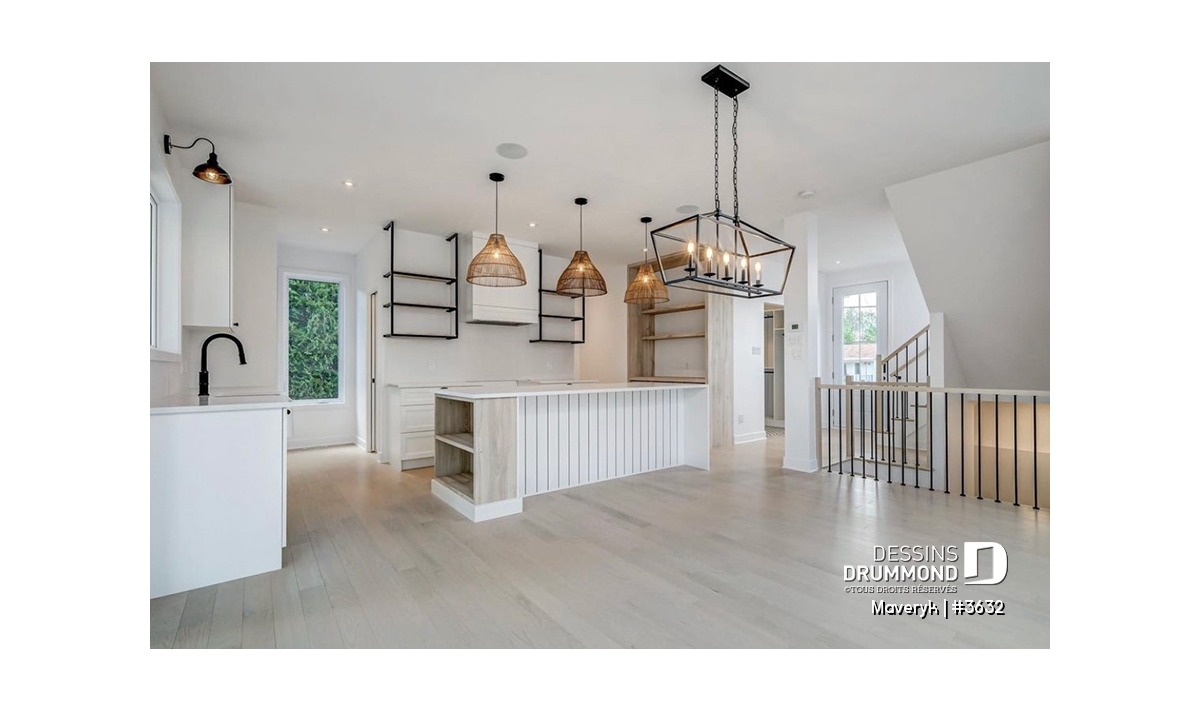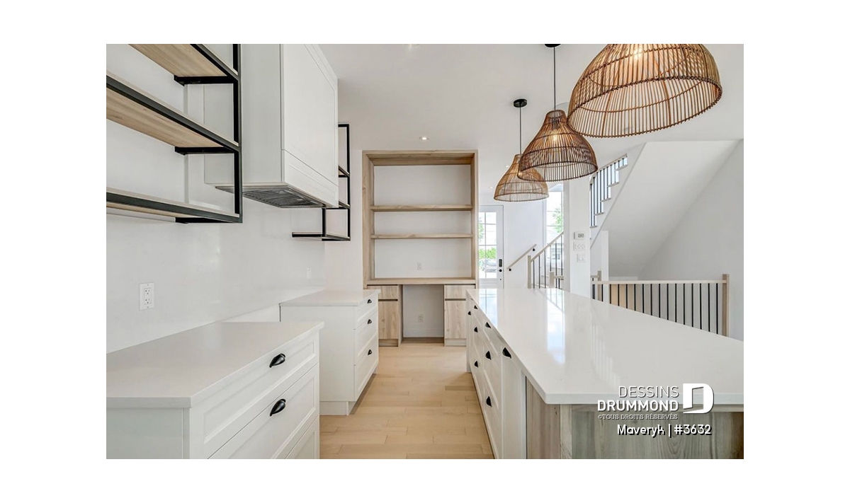 Cuisine avec grand îlot, garde-manger et ouverte sur la salle à manger.