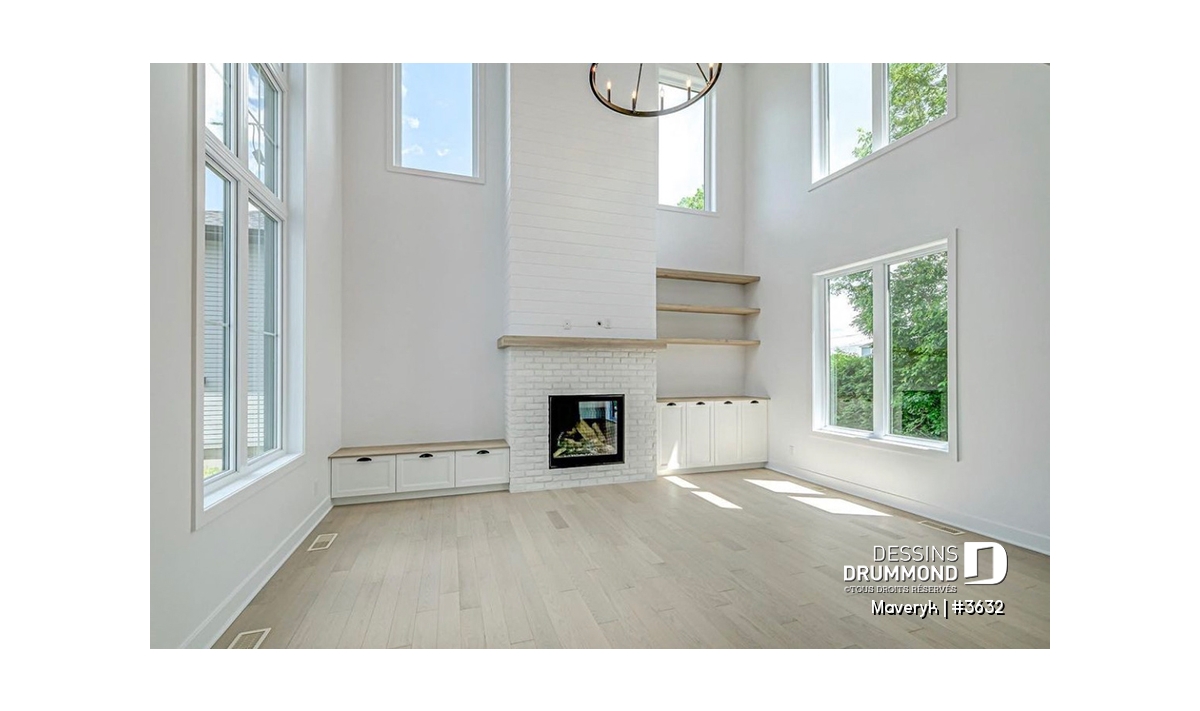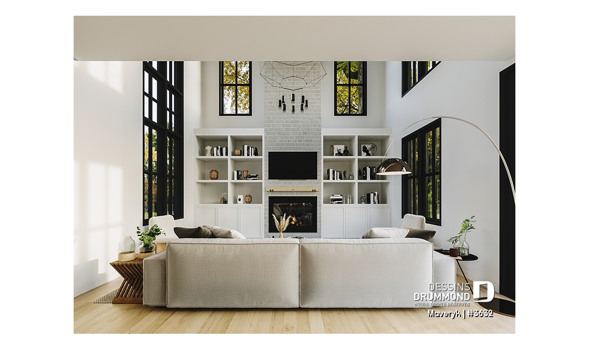 Salon avec foyer et tablettes aménagées de chaque côté.