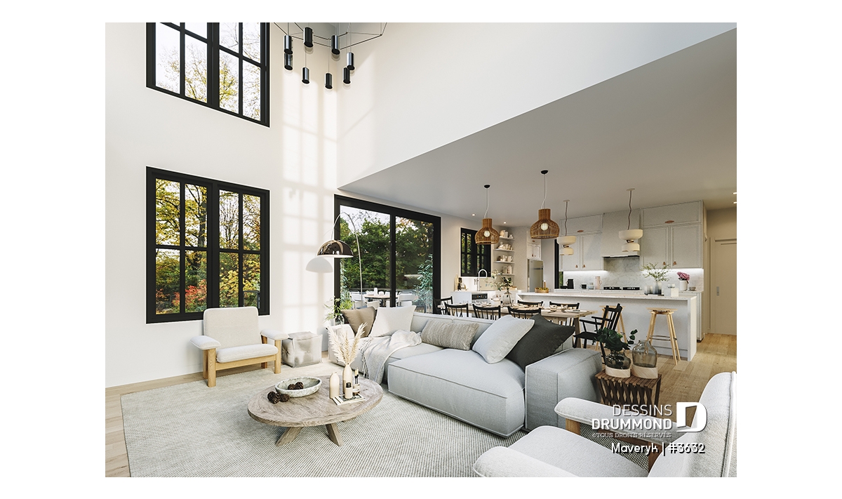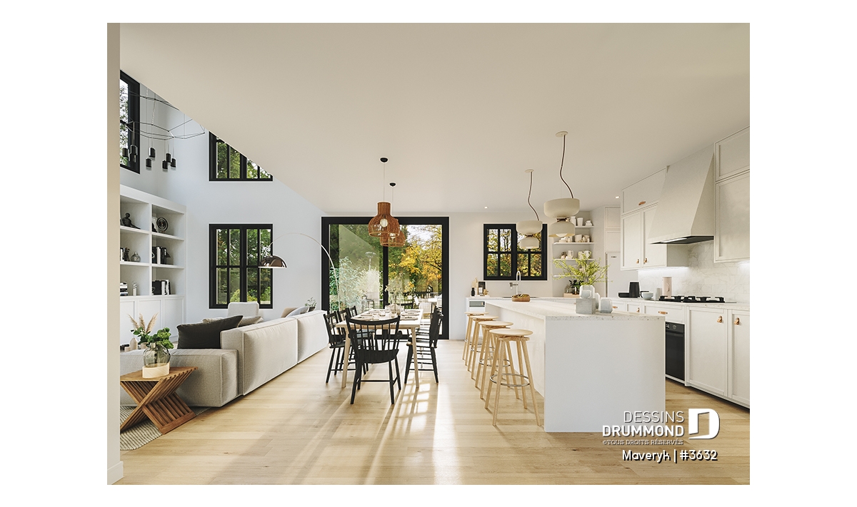 Aire ouverte au secteur cuisine, salle à manger et salon.