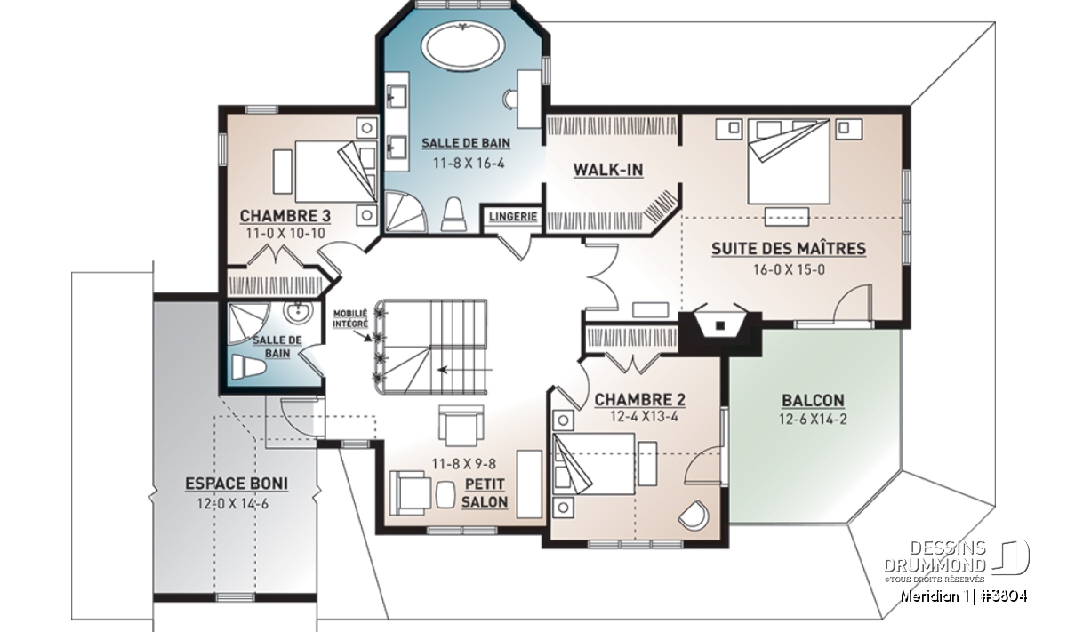 À l’étage, on retrouve toujours 3 chambres et la possibilité d’en aménager une 4è, deux accès à une terrasse à ciel ouvert dont un à la superbe suite des maîtres qui nous épate par son format, par la présence d’un foyer et d’une grande garde robe « walk-in » et, surtout, par une salle de bain privée des plus confortable. Sans oublier l’accès à un espace boni au-dessus du garage. Découvrez plusieurs plans similaires sur http://www.dessinsdrummond.com/.