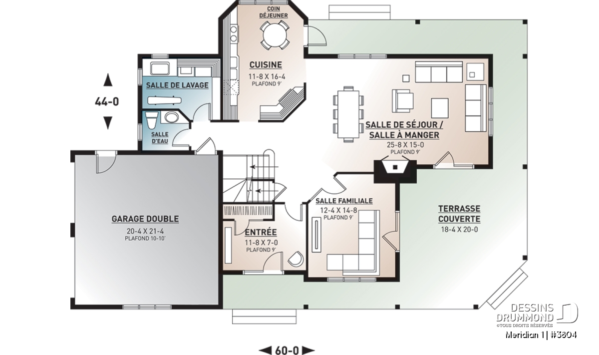 À l’intérieur, on attribue davantage de confort au secteur activités en aménageant la cuisine sur l’arrière et avec un volume en baie permettant d’y loger un coin dînette avec table et accès à la galerie alors qu’on regroupe la salle à manger et la salle de séjour autour d’un foyer bien centré. On obtient une seconde salle familiale ou salle de jeux en remplacement de la salle à manger initiale ( sur le modèle 2837 ) et on améliore le format de la buanderie et du vestibule de l’entrée principale.