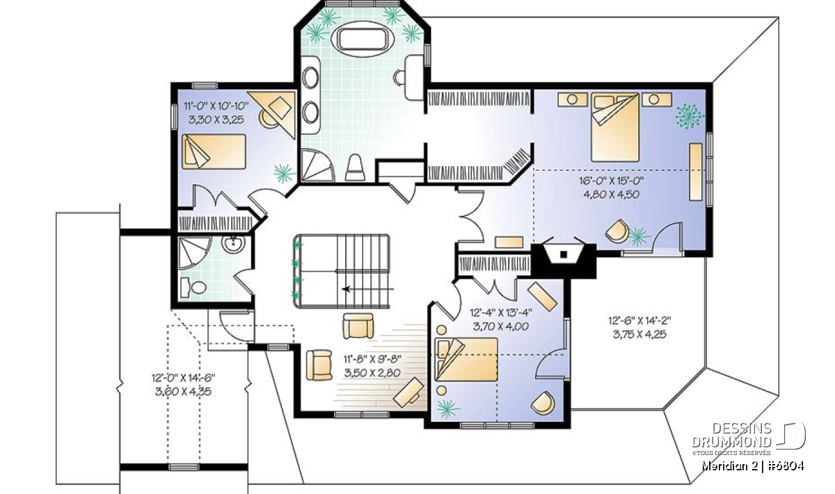 À l’étage, on retrouve toujours 3 chambres et la possibilité d’en aménager une 4è, deux accès à une terrasse à ciel ouvert dont un à la superbe suite des maîtres qui nous épate par son format, par la présence d’un foyer et d’une grande garde robe « walk-in » et, surtout, par une salle de bain privée des plus confortable. Sans oublier l’accès à un espace boni au-dessus du garage. Découvrez plusieurs plans similaires sur http://www.dessinsdrummond.com/.