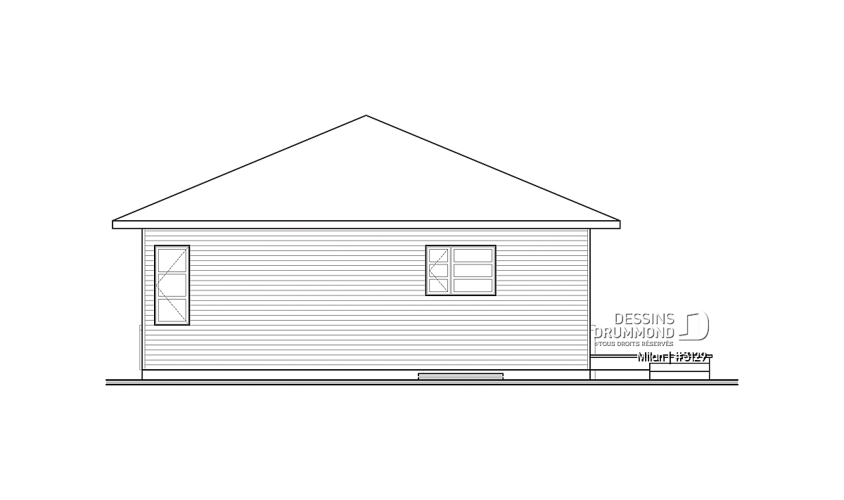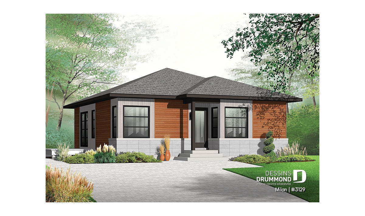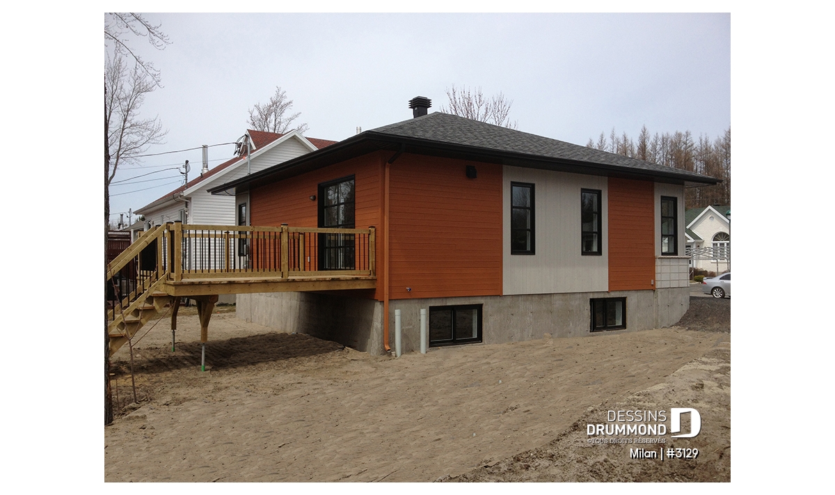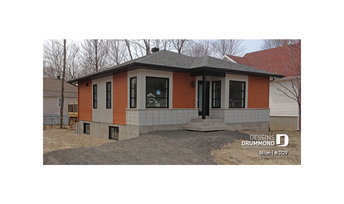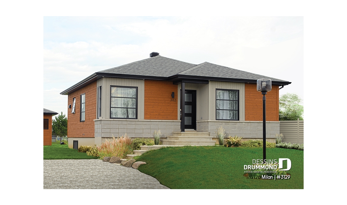Conçu à partir du fort populaire et très abordable modèle 3113, ce plain-pied se veut tout aussi attrayant sinon plus avec son extérieur auquel les nouveaux matériaux tendances comme le bloc architectural et le bois confèrent un tout autre cachet. Sans oublier ces fenêtres, corniches et portes qui, malgré un budget plus élevé d’environ 25% à 30% qu’on devra leur consacrer, assurent davantage de caractère à la maison et une distinction remarquée dans tout le quartier.
