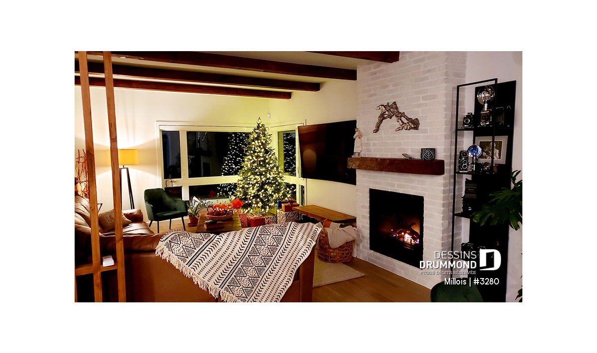 Secteur activités entièrement ouvert avec foyer et fenêtrage abondant à la salle de séjour.