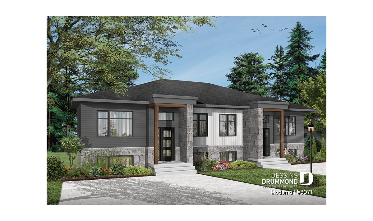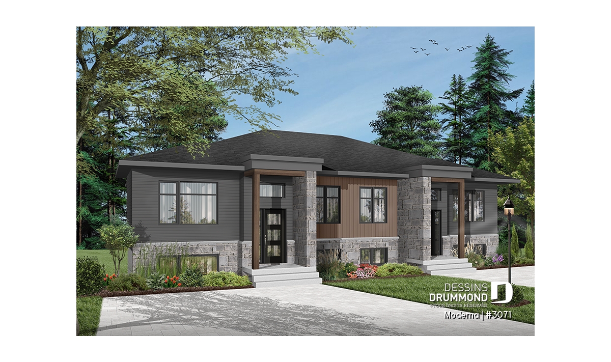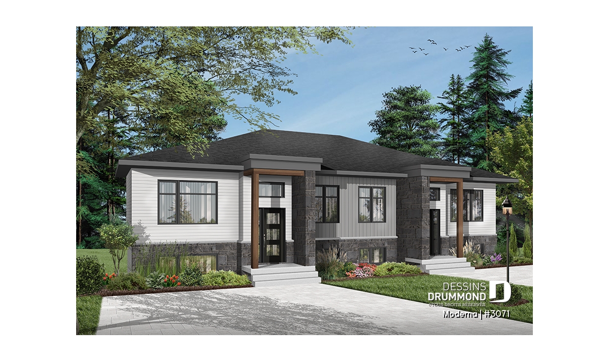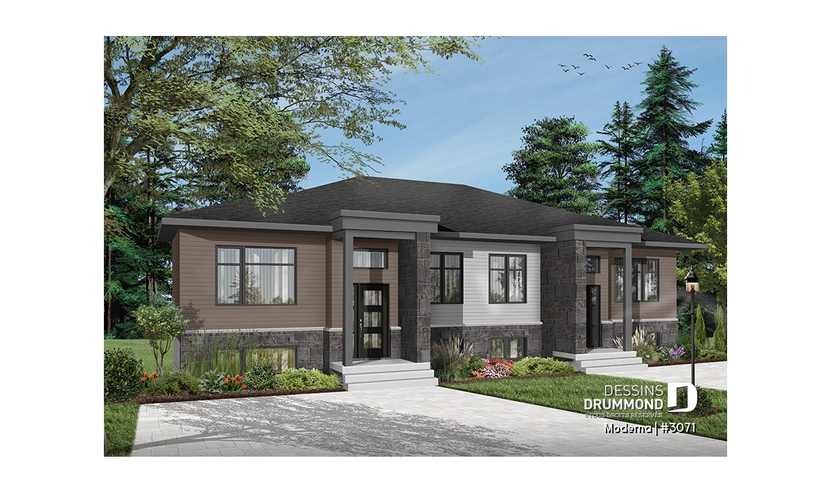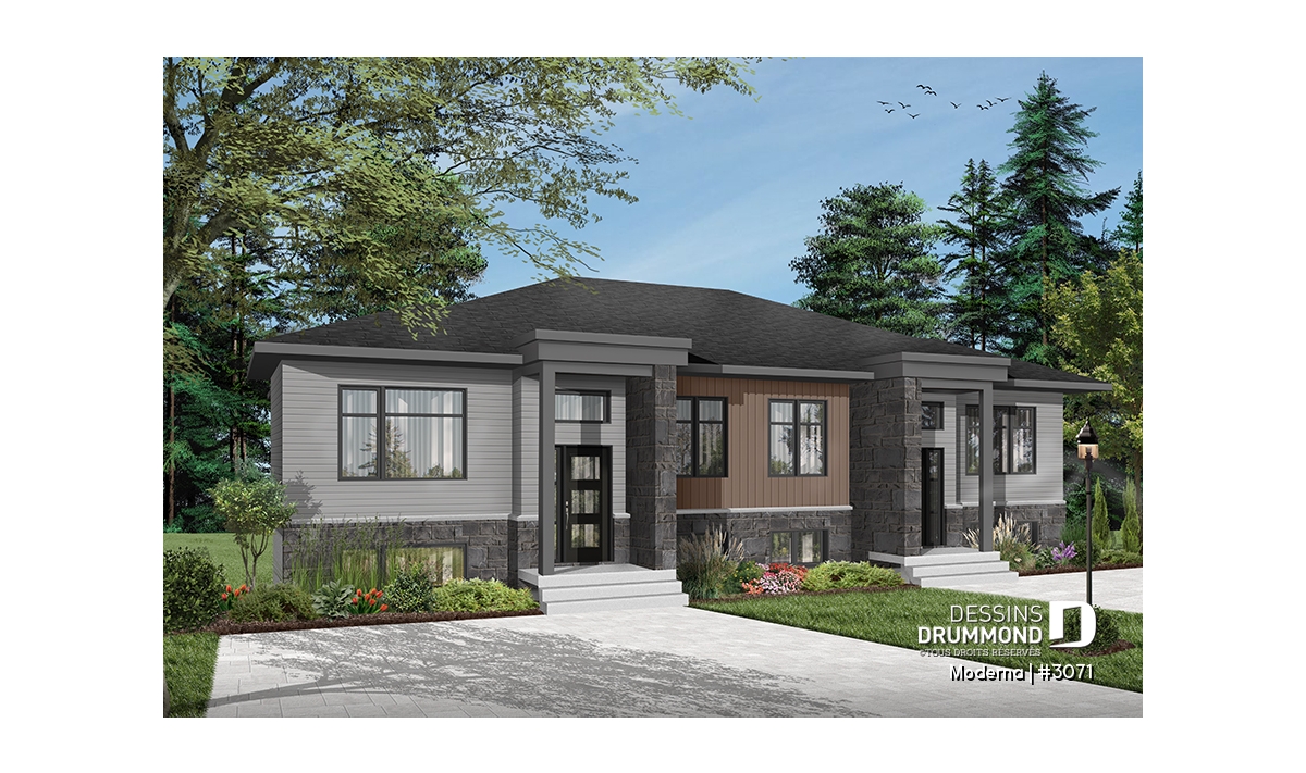 Plan de maisons jumelées no. 3071 (aussi nommé Moderna) très tendance de par ses différents éléments architecturaux modernes et originaux. Ce nouveau plan de jumelé propose un aménagement intérieur des plus intéressants pour chacune de ses deux unités avec ses quatre (4) chambres à coucher, deux salles de bain, et deux salons.