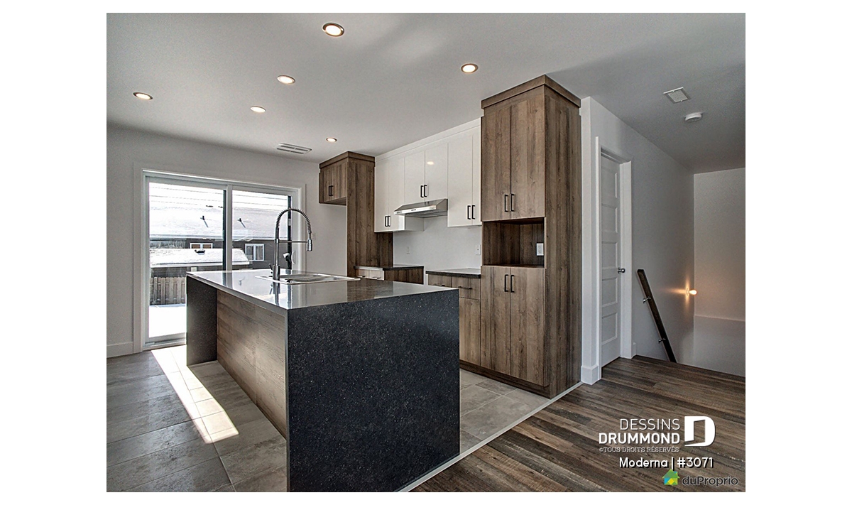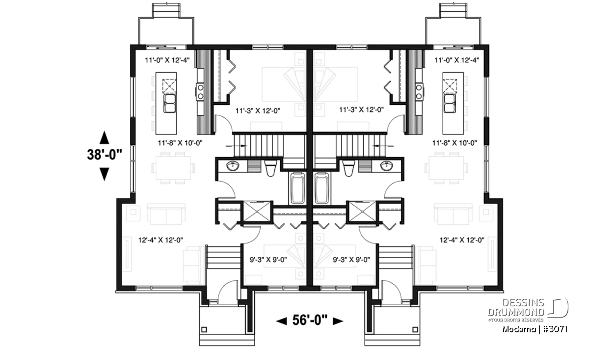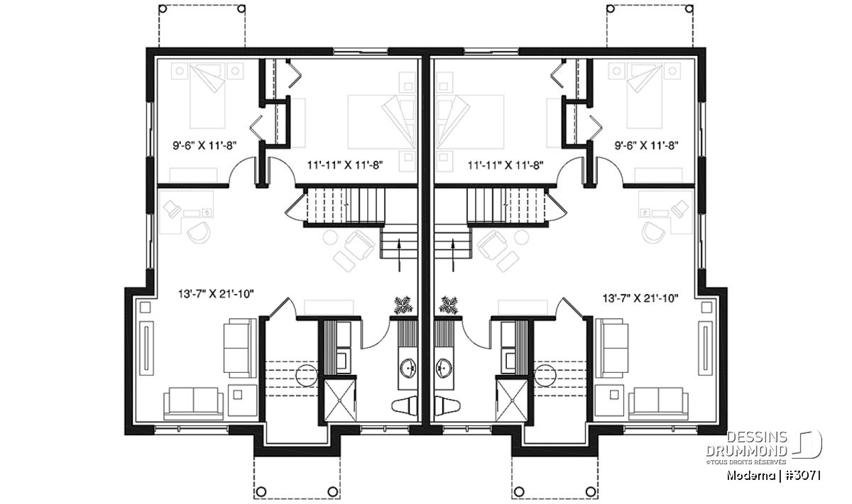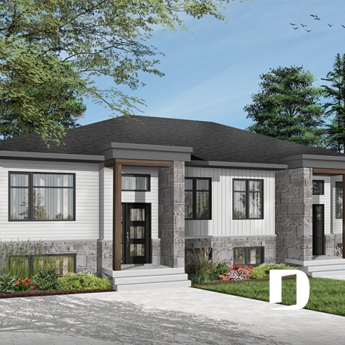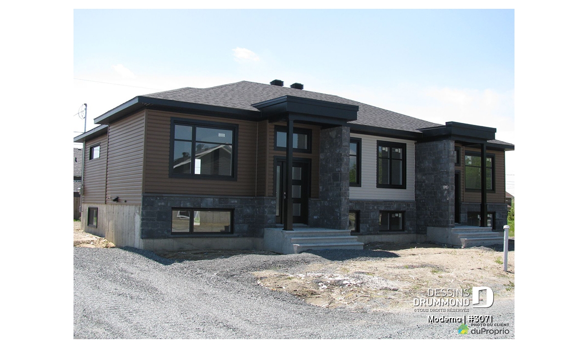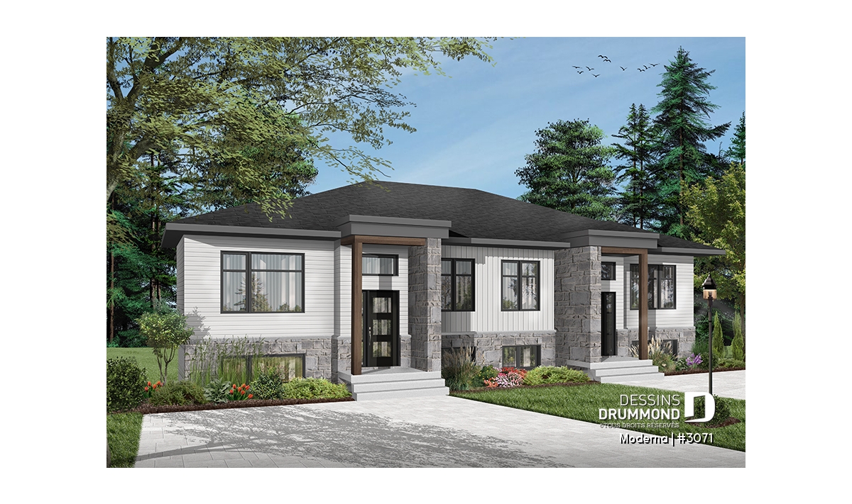 Plan de maisons jumelées no. 3071 (aussi nommé Moderna) très tendance de par ses différents éléments architecturaux modernes et originaux. Ce nouveau plan de jumelé propose un aménagement intérieur des plus intéressants pour chacune de ses deux unités avec ses quatre (4) chambres à coucher, deux salles de bain, et deux salons.