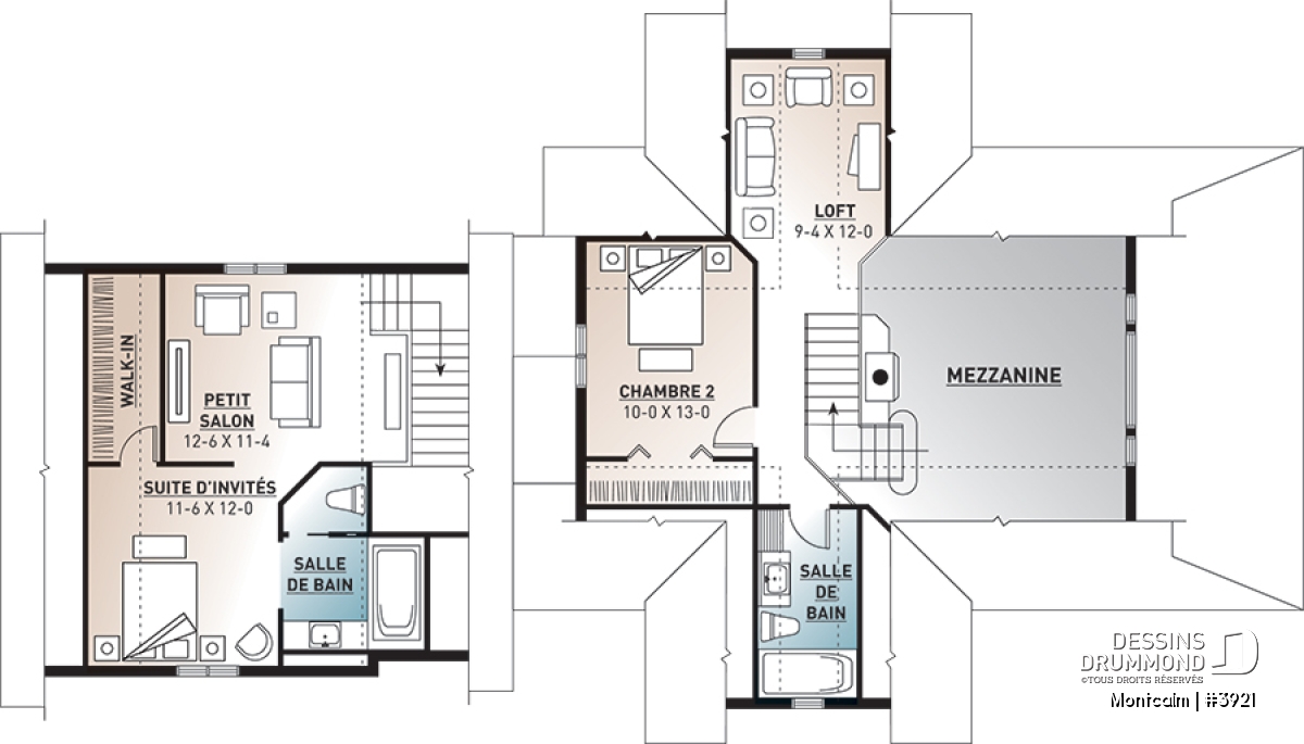 Étage - Plan de maison champêtre style chalet, garage double, 3 à 4 chambres, suite pour invités au-dessus du garage - Montcalm