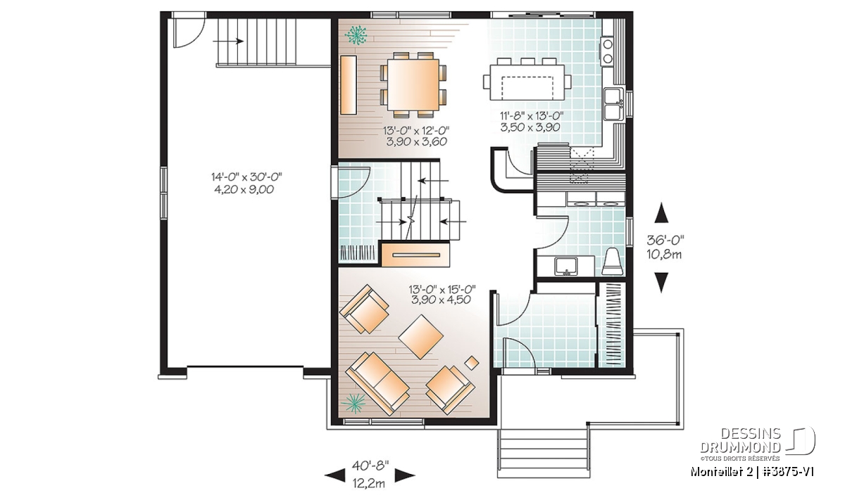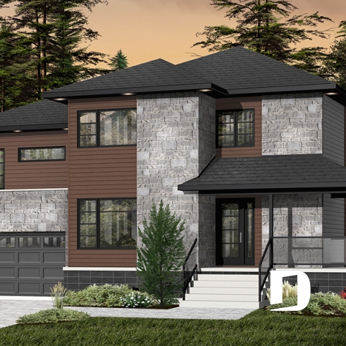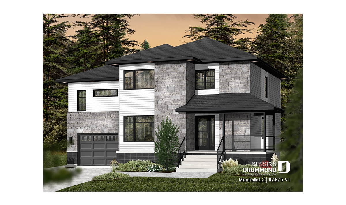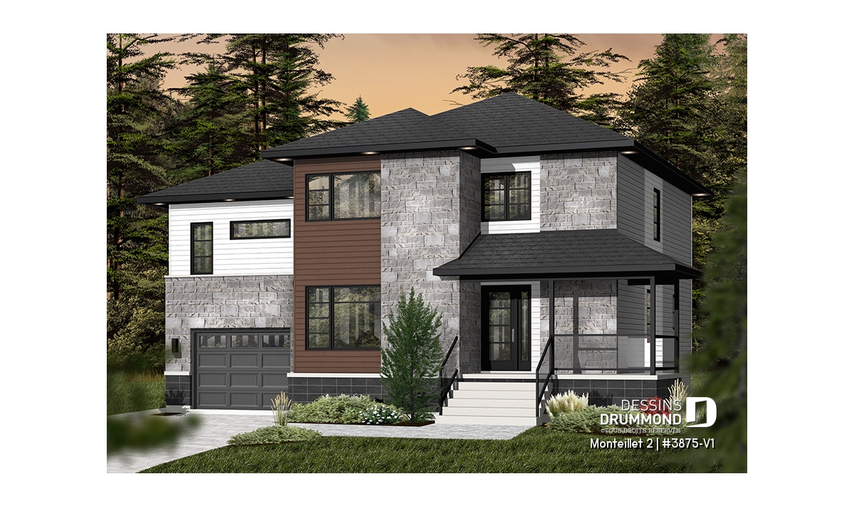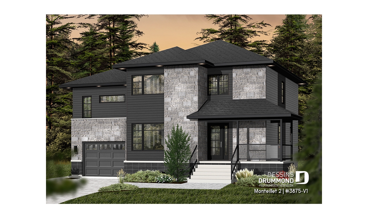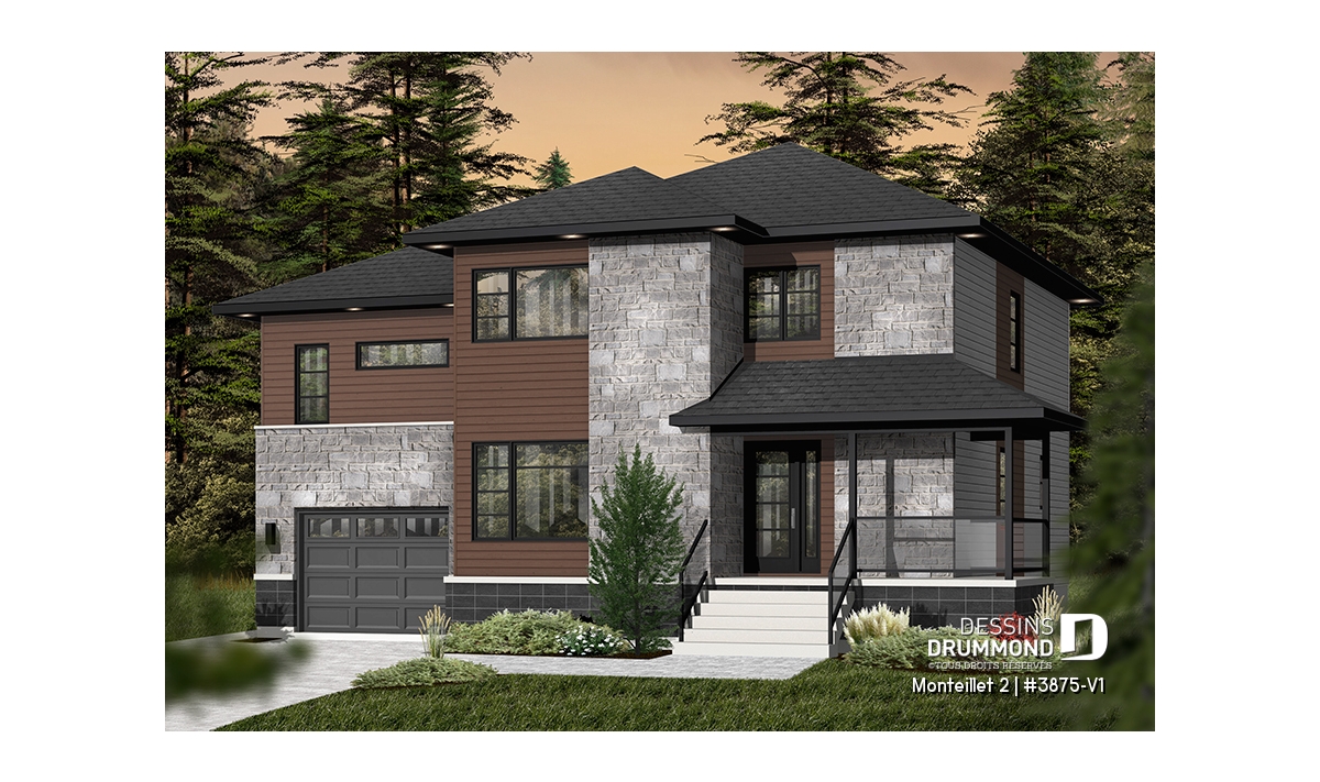 Cottage contemporain conçu à partir du très prisé plan 3875, ce modèle version suggère l’ajout d’un volume étage au-dessus du garage permettant ainsi l’aménagement d’une chambre additionnelle et d’une salle familiale particulièrement bien située et toute en lumière au contraire d’une telle salle située dans un sous-sol.