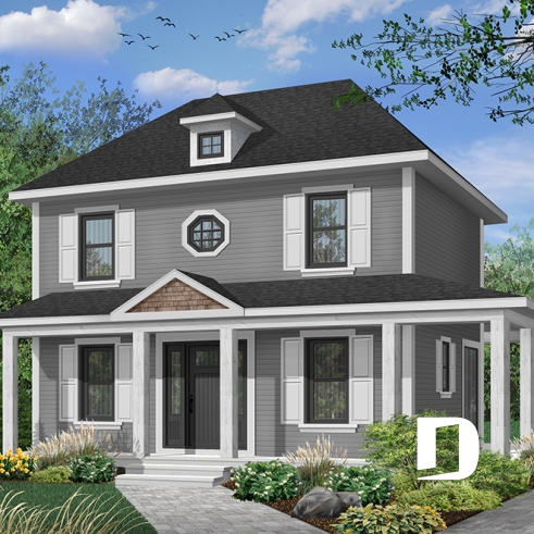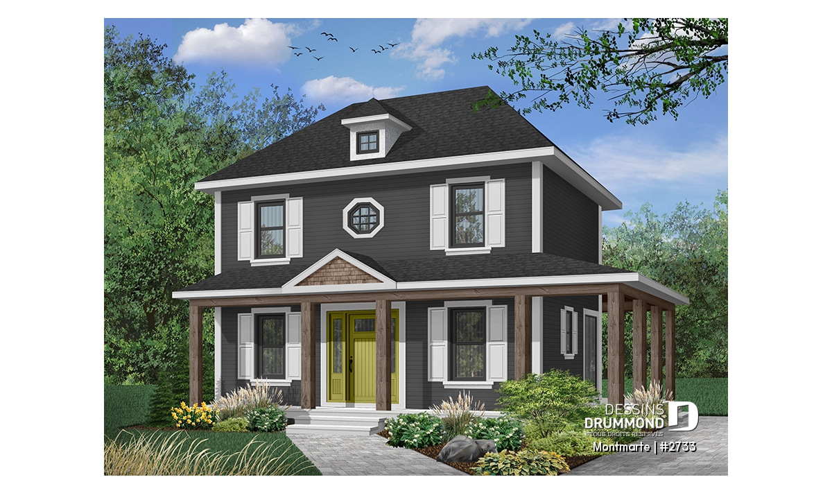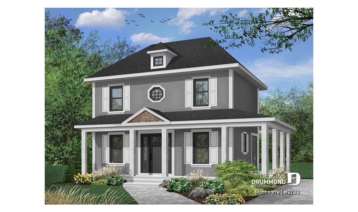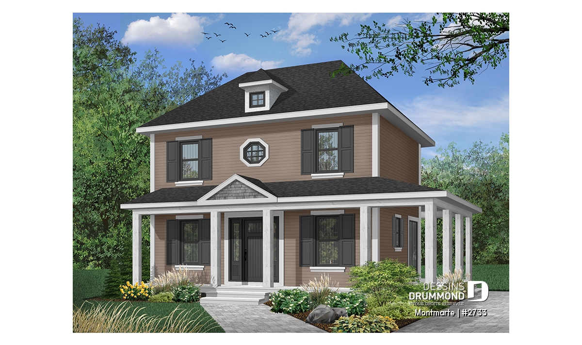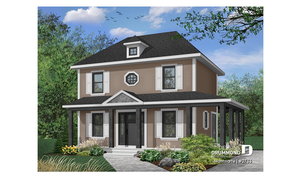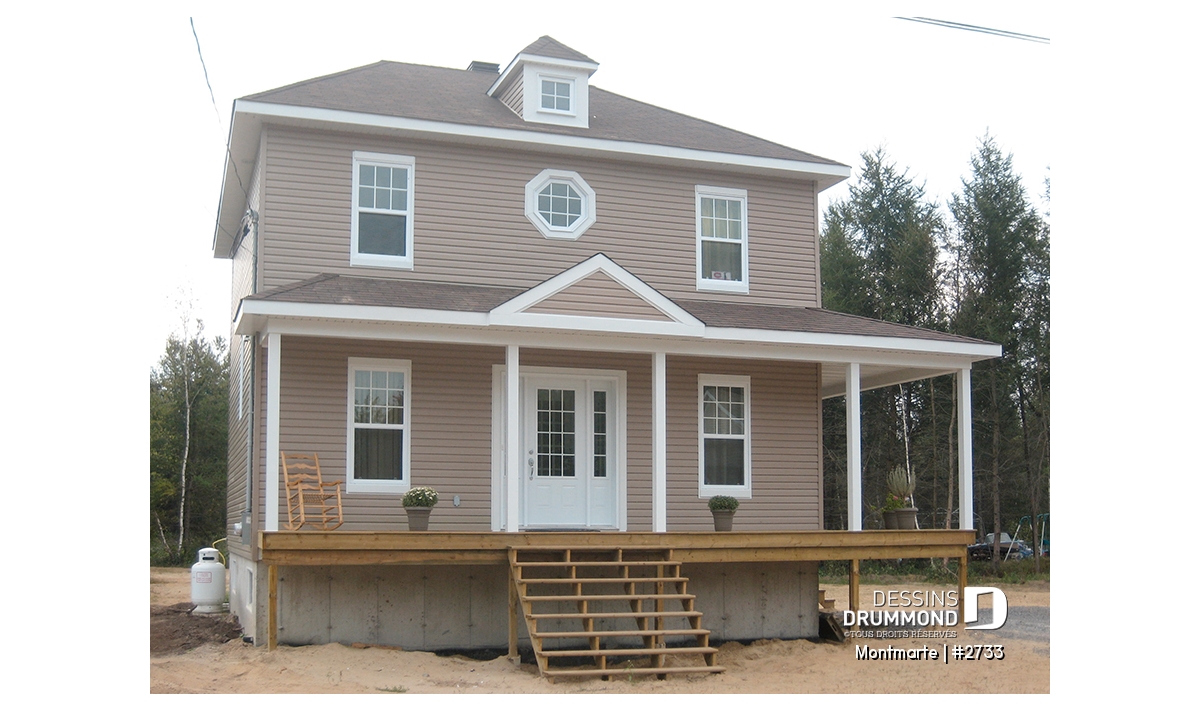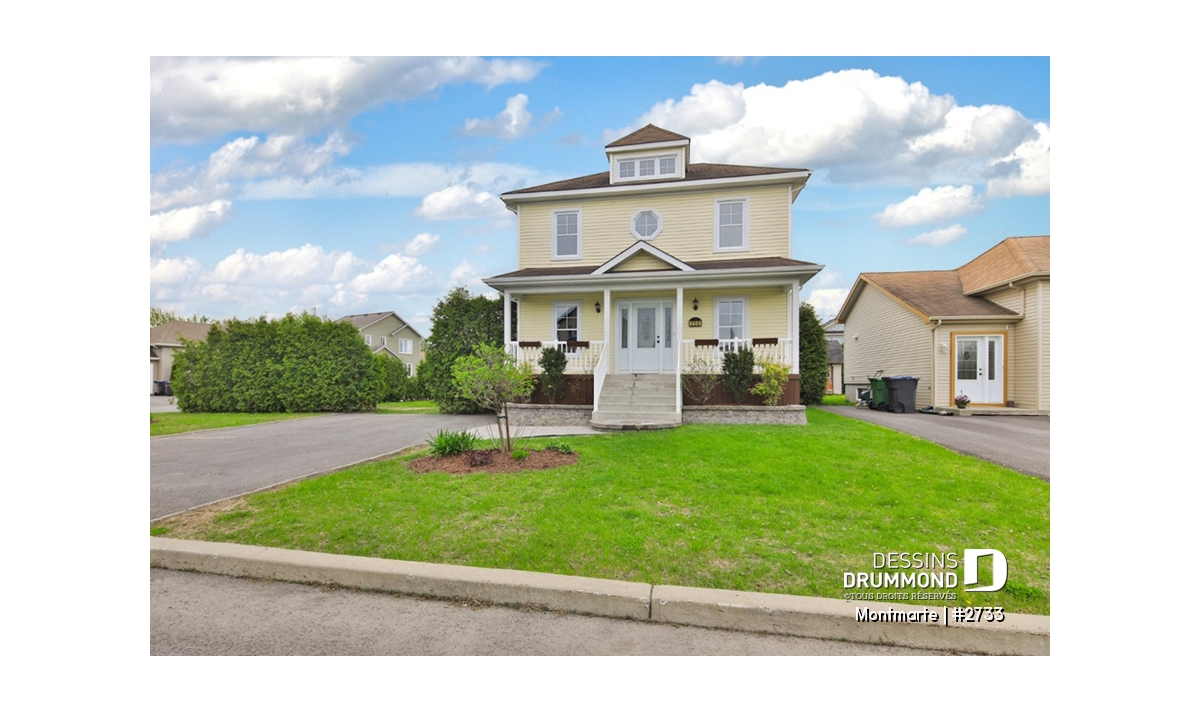 Vue avant - MODÈLE DE BASE - Plan de maison style anglais, 3 chambres, 2 salles de bain complètes, cuisine fort originale - Montmarte