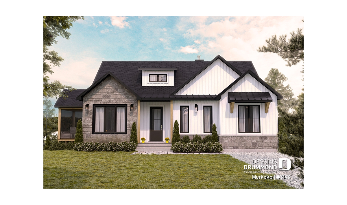 Vue avant - MODÈLE DE BASE - Plain-pied Farmhouse 1 à 4 chambres, bureau, cuisine avec garde-manger, finition sous-sol optionnelle ($) - Muskoka