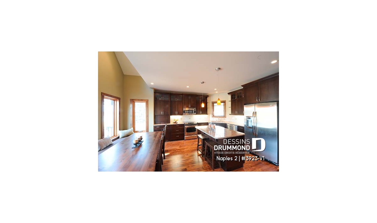À l’intérieur, une fois le vestibule franchi, on est déjà emballés par l’espace intérieur que procure ce plafond cathédrale à la salle de séjour et auquel s’ajoute un plafond à 9 pieds sur la balance du rez-de-chaussée. Ici, la salle à manger intégrée à la cuisine, sur le plan d’origine 3923, fait place à un îlot central et se transforme en banquette dans cette belle fenêtre en saillie donnant sur l’arrière. Autre point important à souligner, l’aménagement d’un coin laveuse/sécheuse au rez-de-chaussée.