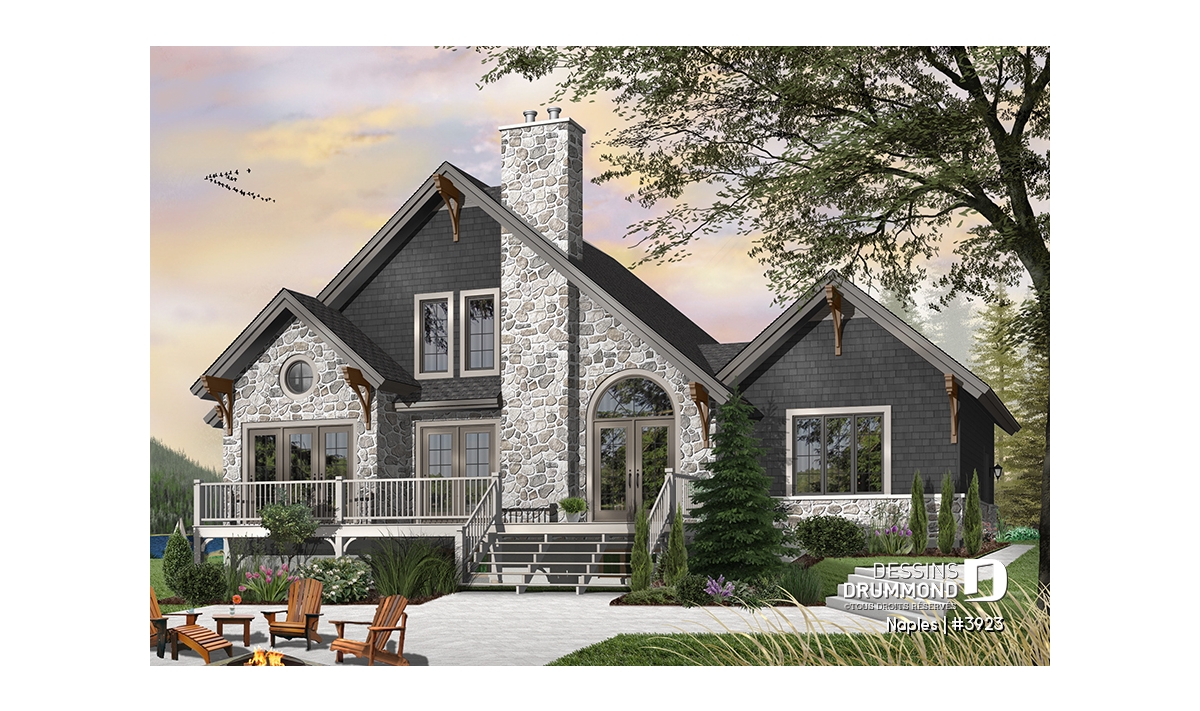 Nous obtenons par le fait même un « chalet » suggérant un garage bien intégré et de bon gabarit, une suite chambre des maîtres avec salle de bain privée et garde-robe « walk-in », une cuisine encore plus dégagée afin de faciliter la disposition d’une table pour au moins huit convives et une salle de séjour encore plus logeable et agrémentée de ce majestueux foyer si bien localisé.