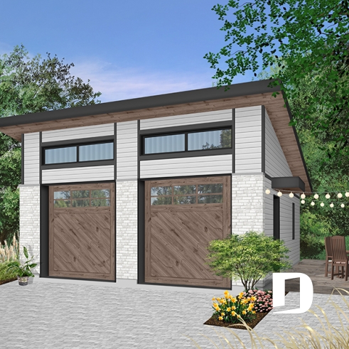 Plan de garage pour 2 voitures, avec 2 portes de garage, accès latéral par une porte, 2 fenêtres
