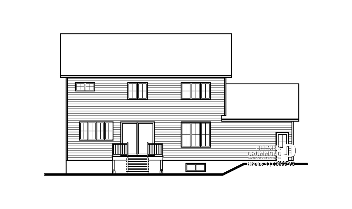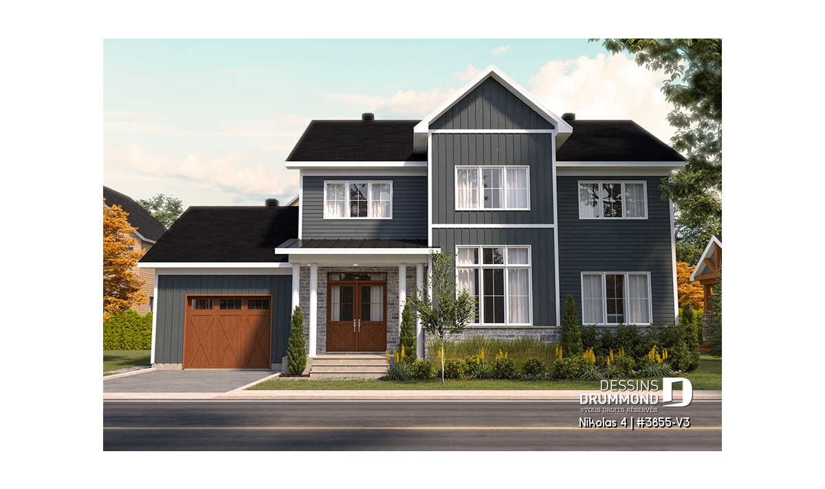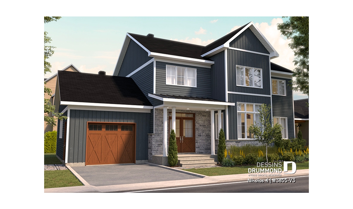 Le plan de maison NIKOLAS 4 (3855-V3) propose 2041 pi.ca. aménagés sur 2 étages, sans inclure le sous-sol qui est non fini. De plus, cette belle et grande maison familiale de style champêtre farmhouse a un garage qui propose un accès au sous-sol et aussi à la maison, via le secteur vestiaire. Tous les planchers du rez-de-chaussée sont à 9' de hauteur.