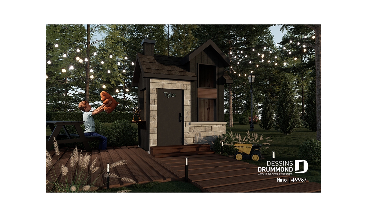 Inspirée du magnifique plan Dumont #3897, cette adorable maisonnette propose une version miniature d’un design scandinave élégant, rehaussé d’une touche de style farmhouse moderne. Compacte mais pleine de personnalité, elle attire le regard par sa silhouette épurée et ses revêtements foncés, mariant avec goût le bois et la pierre pour un effet à la fois chic et chaleureux.