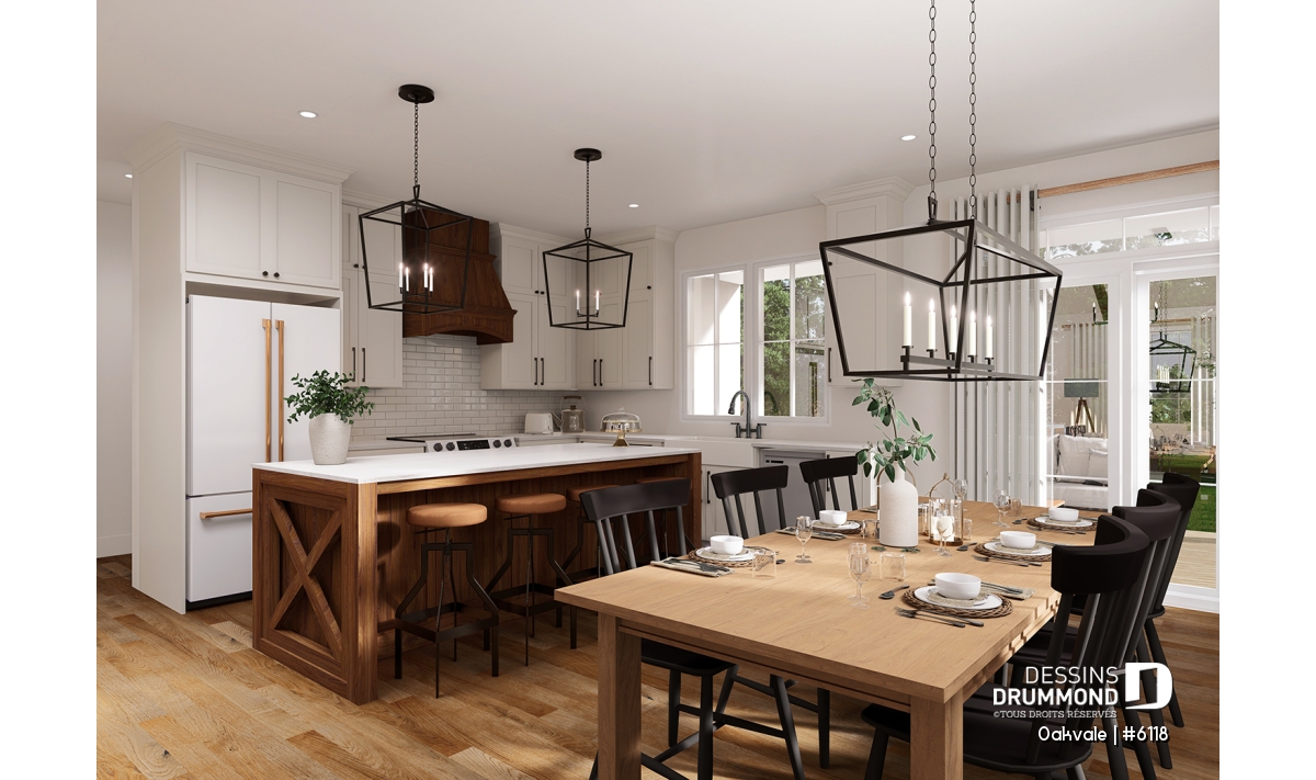 La cuisine possède un garde-manger et un îlot central, et est ouverte sur la salle à manger.