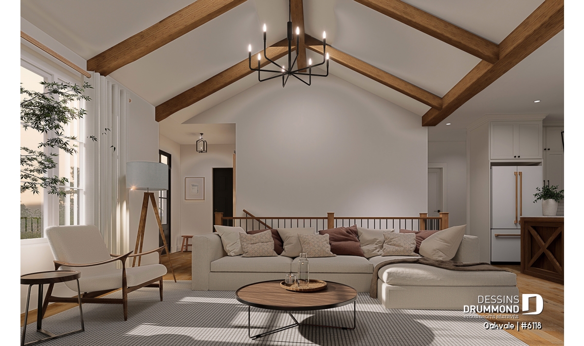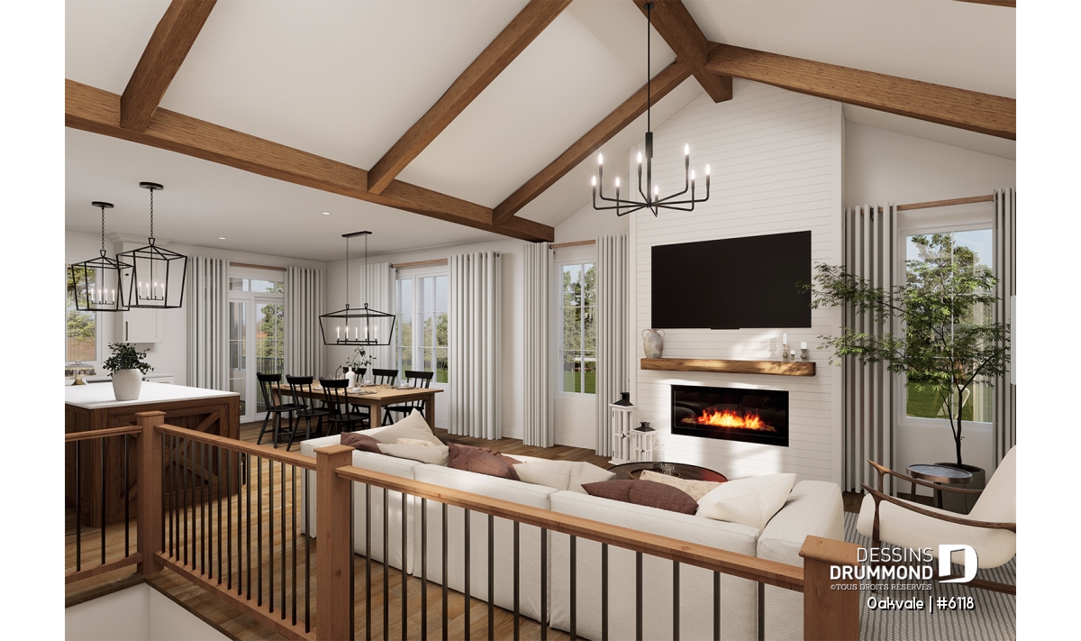 Le salon, avec plafond cathédral, est ouvert sur la cuisine et la salle à manger.