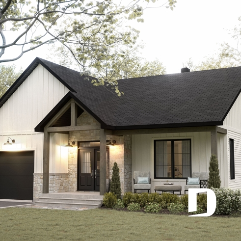 Plan de plain-pied de style champêtre, avec garage simple de bon format.