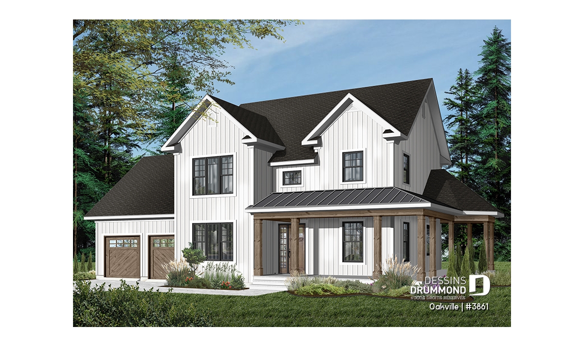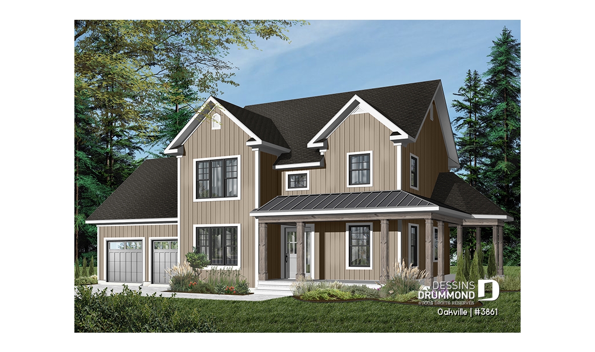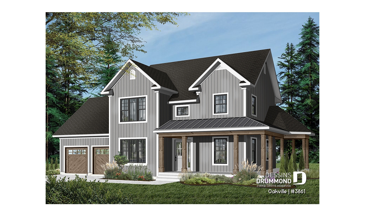 Voici la version avec garage double d’un modèle déjà fort populaire, le 2741 sur dessinsdrummond.com. Parions que celle-ci saura combler d’autres attentes avec ce garage double et le superbe espace boni aménagé au-dessus de celui-ci. Sans oublier le charme indiscutable de cette galerie couverte et de la demie-gloriette facilitant l’aménagement d’un coin lunch extérieur abrité.