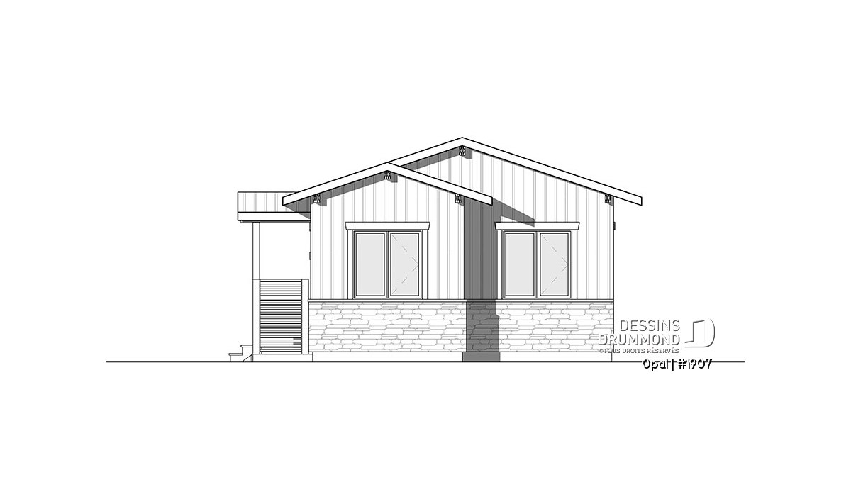 L’espace sommeil est situé à l’extrémité du séjour permettant ainsi aux occupants la quiétude requise pour dormir tranquille. Les chambres #1 et #3 peuvent accueillir des lits doubles et même « queen » dans le cas de la chambre des maîtres, et contiennent l’espace suffisant pour du mobilier intégré. Située au centre de la maison, une salle de douche vient compléter ce plancher à la fois évolutif et efficace. De plus, la fondation est de type vide sanitaire, question de coûts, mais peut facilement être changée selon vos besoins, dans l’une des 23 agences Dessins Drummond au Québec et NB.