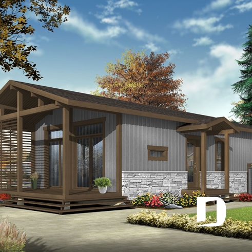 Plan de petit plain-pied moderne rustique, 2+ chambres, abordable, grand balcon couvert