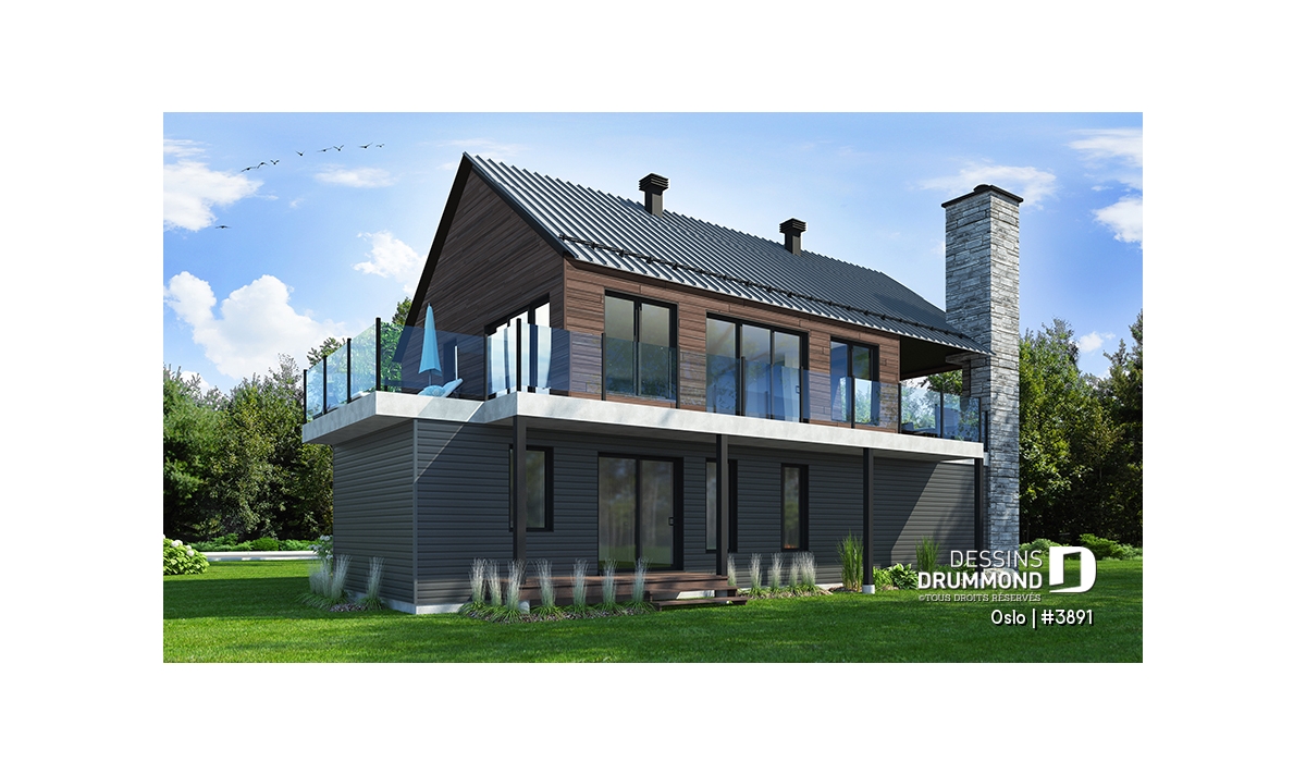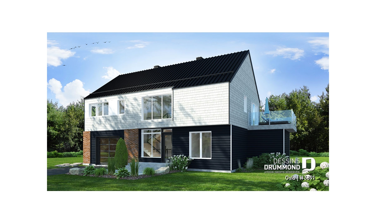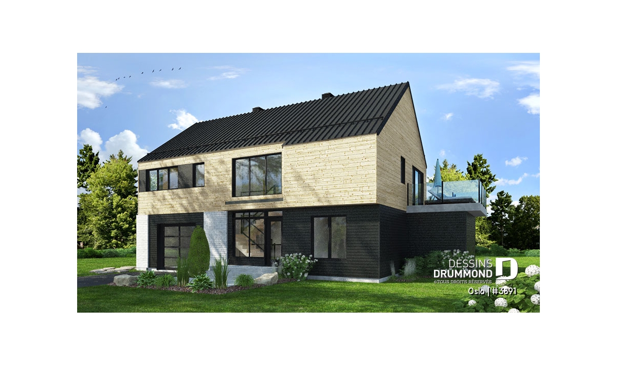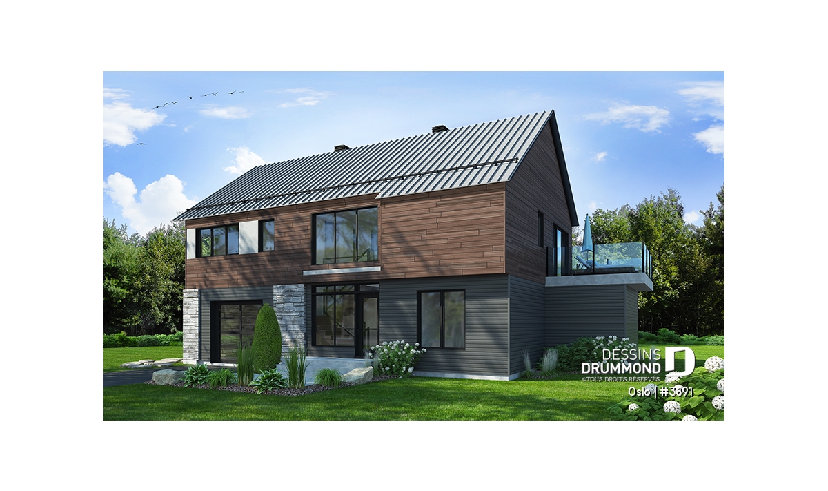 Modèle de maison de style Moderne Rustique, d’inspiration Scandinave, le nouveau plan no. 3891 aussi appelé Oslo, propose un heureux mariage de matériaux nobles, aux teintes rustiques et chaleureuses à la fois. L’élément vedette de cette superbe maison est sans aucun doute la généreuse terrasse, partiellement abritée à l’étage, qui propose un foyer extérieur au bois, question de devancer l’été ou de le prolonger bien au chaud et à l’abri des intempéries. Ce modèle avec garage sera parfait pour une construction sur un terrain proposant une vue panoramique sur un plan d’eau, une montagne ou un paysage pittoresque de campagne.