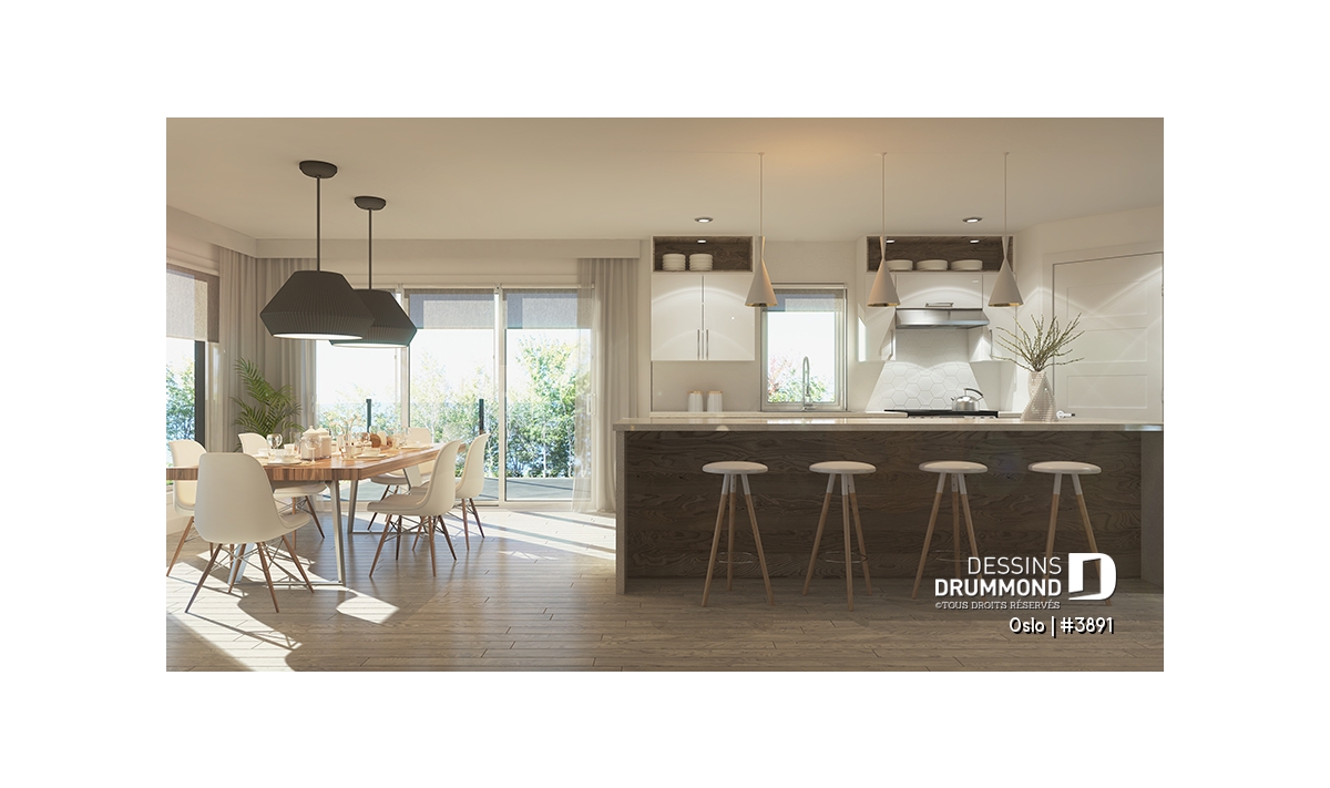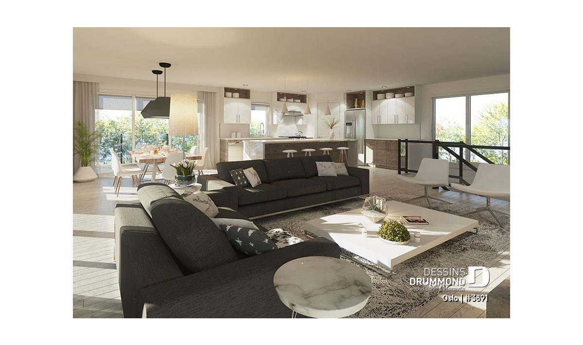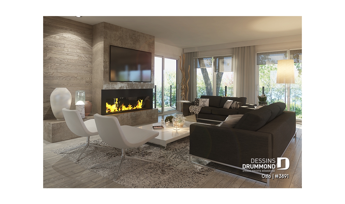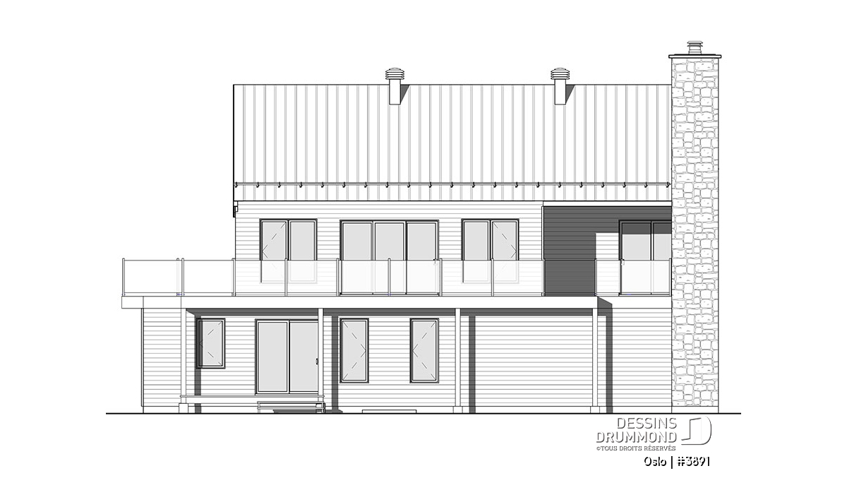 Modèle de maison de style Moderne Rustique, d’inspiration Scandinave, le nouveau plan no. 3891 aussi appelé Oslo, propose un heureux mariage de matériaux nobles, aux teintes rustiques et chaleureuses à la fois. L’élément vedette de cette superbe maison est sans aucun doute la généreuse terrasse, partiellement abritée à l’étage, qui propose un foyer extérieur au bois, question de devancer l’été ou de le prolonger bien au chaud et à l’abri des intempéries. Ce modèle avec garage sera parfait pour une construction sur un terrain proposant une vue panoramique sur un plan d’eau, une montagne ou un paysage pittoresque de campagne.