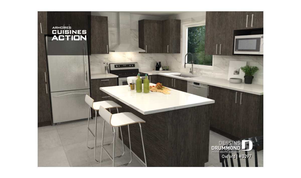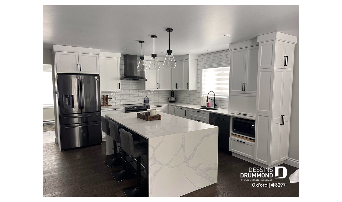 La cuisine est confortable et comporte un îlot central, un garde-manger et est ouverte sur le secteur salle à manger. Cette dernière est aussi à aire ouverte sur le salon.