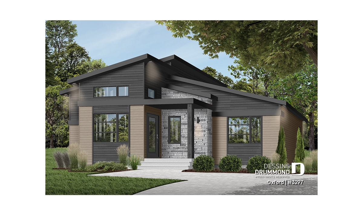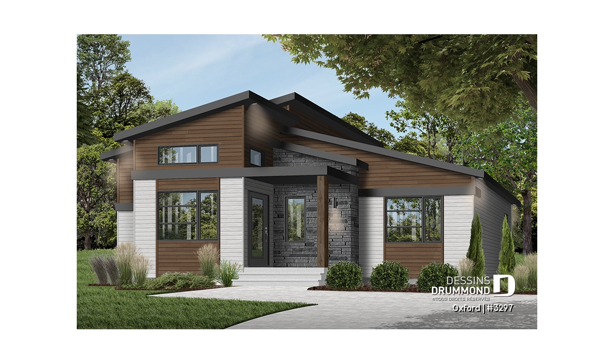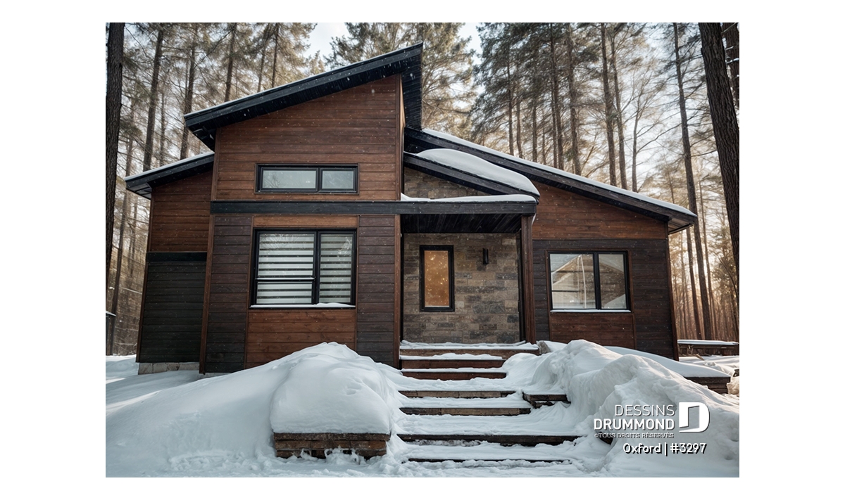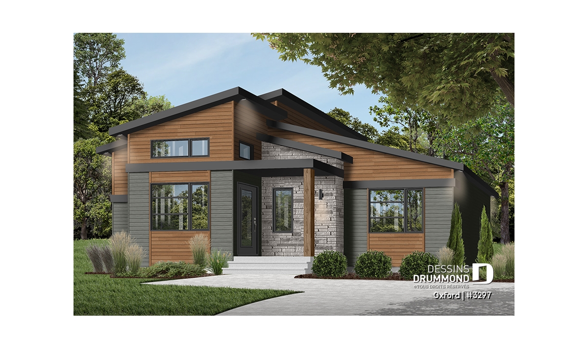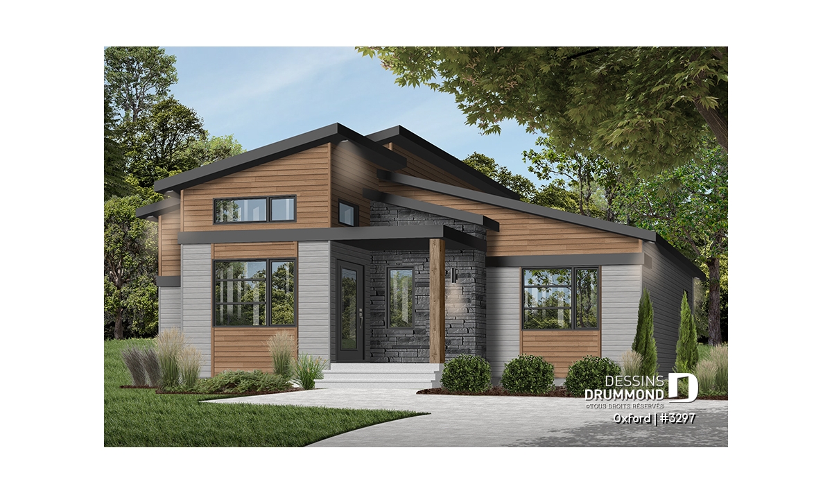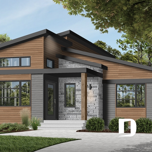 Plan de bungalow 1 chambre avec toit en pente de style contemporain rustique, aire ouverte, vestiaire