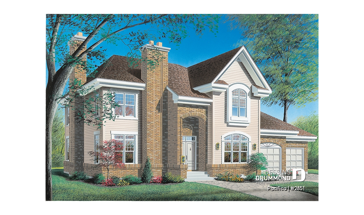 Plan de maison à étage de style traditionnelle, avec garage double.