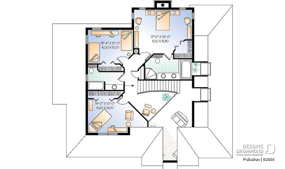 À l’étage, on constate d’abord une belle lumière naturelle projetée par un puits de lumière donnant sur l’escalier et la mezzanine. On apprécie, de plus, deux belles chambres secondaires se partageant une salle de bain, la présence d’une chute à linge ainsi qu’une grande chambre des maîtres avec une garde-robe de type « walk-in » et une salle de bain fort bien organisée et dotée à son tour d’un puits de lumière.