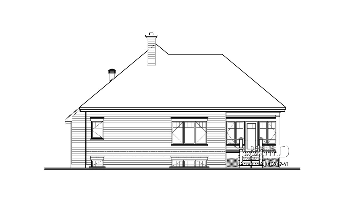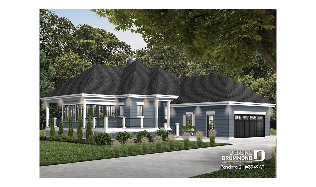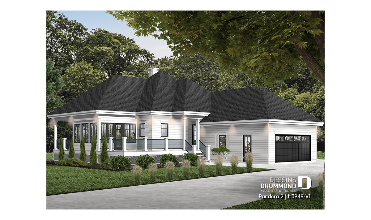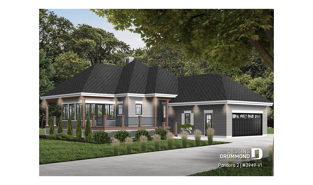 Vous appréciez le plan 3949 pour ses beaux espaces intérieurs, sa vue panoramique, sa grande terrasse et son abri-moustiquaire fort bien intégré mais vous êtes déçu du fait qu’il ne propose pas une seconde chambre au rez-de-chaussée ? Eh bien voilà que ce modèle 3949-V1 fait son apparition et vous propose, avec ses 75 pi2 additionnels, non seulement cette seconde chambre tant convoitée mais aussi un garage double attaché à la maison et, en prime, un coin laveuse/sécheuse que plusieurs apprécieront au rez-de-chaussée.