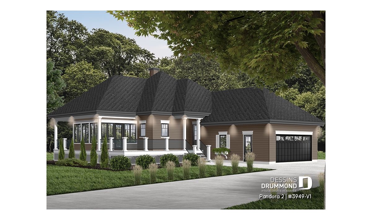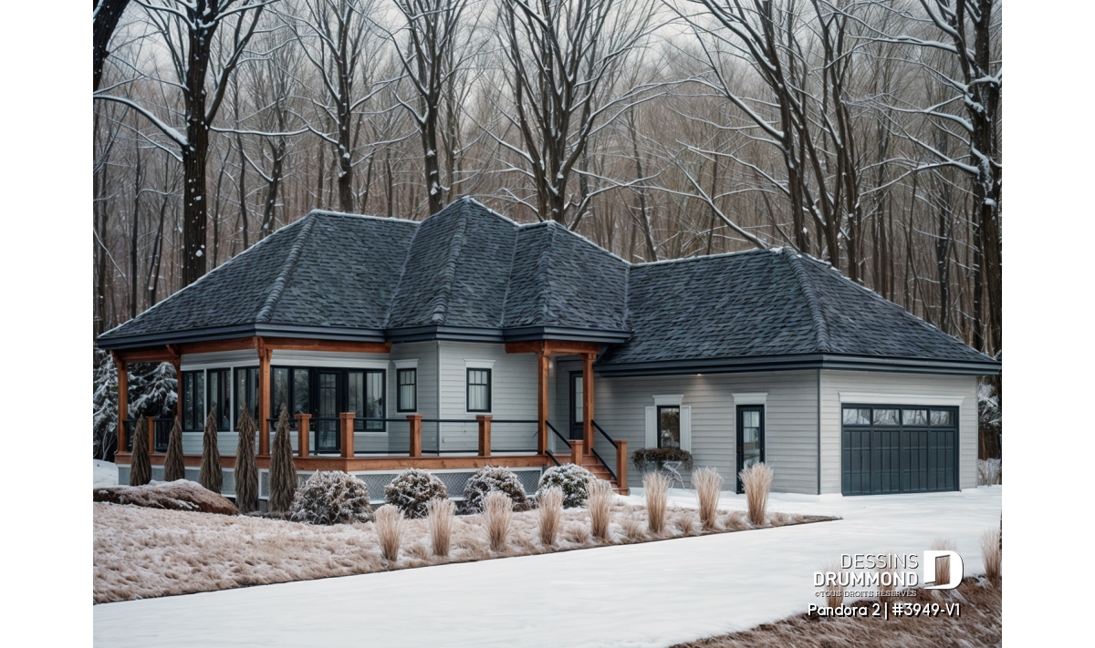 Vue avant - MODÈLE DE BASE - Plan de chalet 2 chambres, garage double, terasse et abri moustiquaire, 2 salles de bain, buanderie au r-d-c - Pandora 2