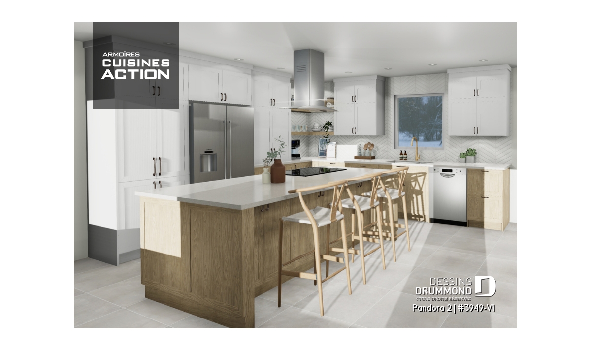 Ainsi, à l’instar du plan d’origine 3949, ce modèle version suggère une cuisine fort logeable, avec îlot-lunch central, et entièrement ouverte sur une salle à manger et une salle de séjour abondamment fenêtrées et dotées de portes-jardin donnant accès, sur ce 3949-V1, directement au solarium. Il en va aussi d’une chambre des maîtres de beau format qui devient suite des maîtres avec l’acquisition de sa propre salle de bain pour laquelle on assiste à l’élimination du bain et à l’aménagement d’une douche de 72po x 42po comme tant recherchée.