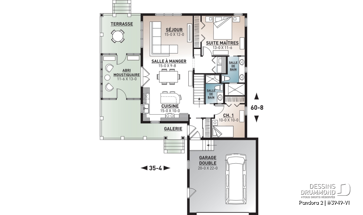 Rez-de-chaussée - Plan de chalet 2 chambres, garage double, terasse et abri moustiquaire, 2 salles de bain, buanderie au r-d-c - Pandora 2