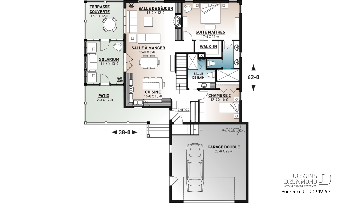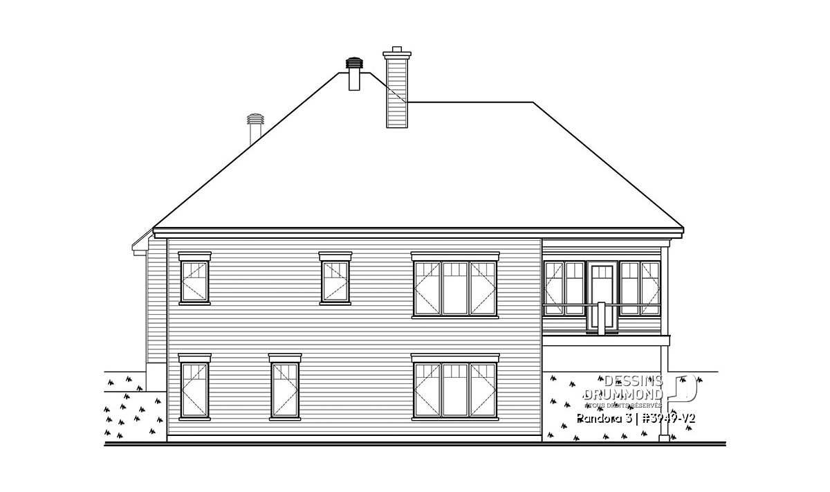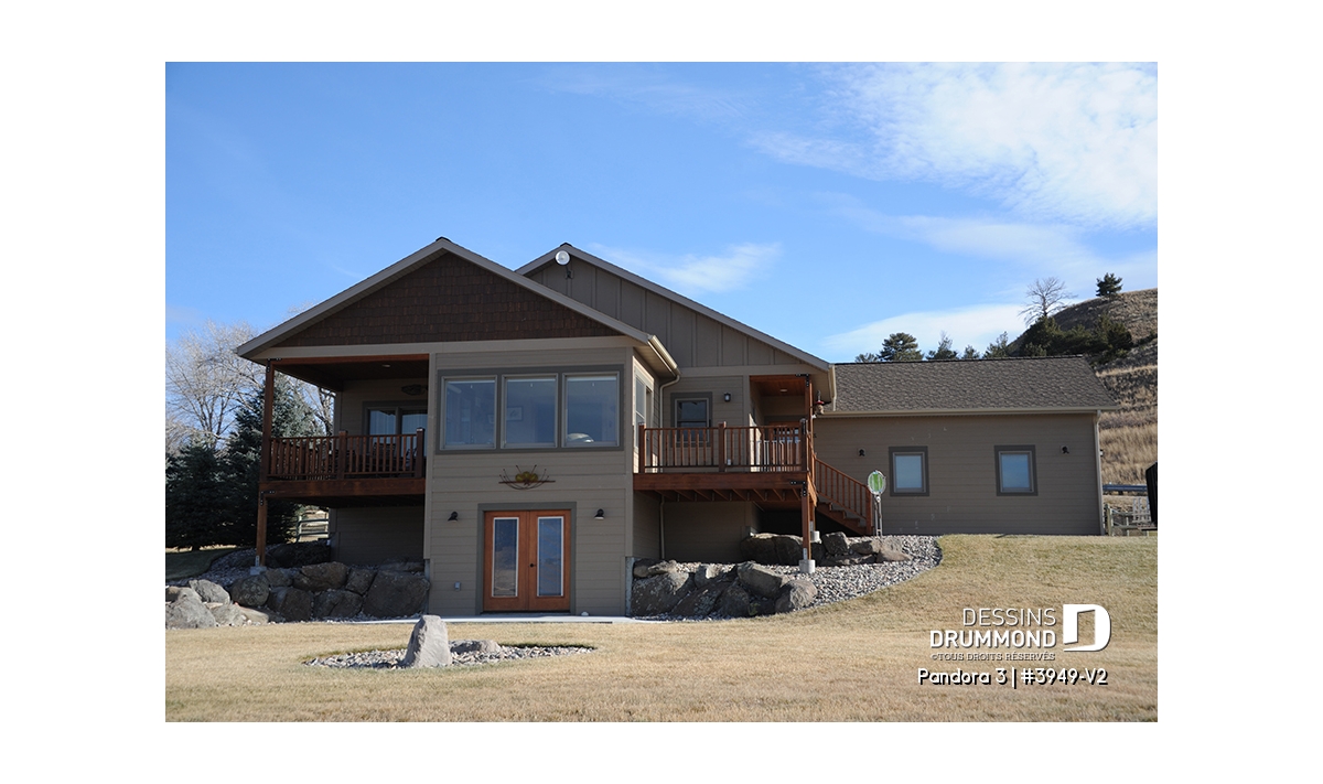 Vous appréciez le plan de chalet Dessins Drummond # 3949 ou # 3949-V1 (ou plan plain-pied de style chalet 4-saisons) pour ses beaux espaces intérieurs, sa vue panoramique, ses grandes terrasses et son solarium fort bien intégré près de la salle à manger, mais vous êtes déçus du fait qu’il ne propose pas davantage de chambres et d’aires communes ? Eh bien voilà que ce modèle de chalet Dessins Drummond # 3949-V2 fait son apparition et vous propose 2 chambres additionnelles et un sous-sol en rez-de-jardin entièrement aménagé! Et en bonus, un petit réaménagement de la salle de séjour et chambre des maîtres!