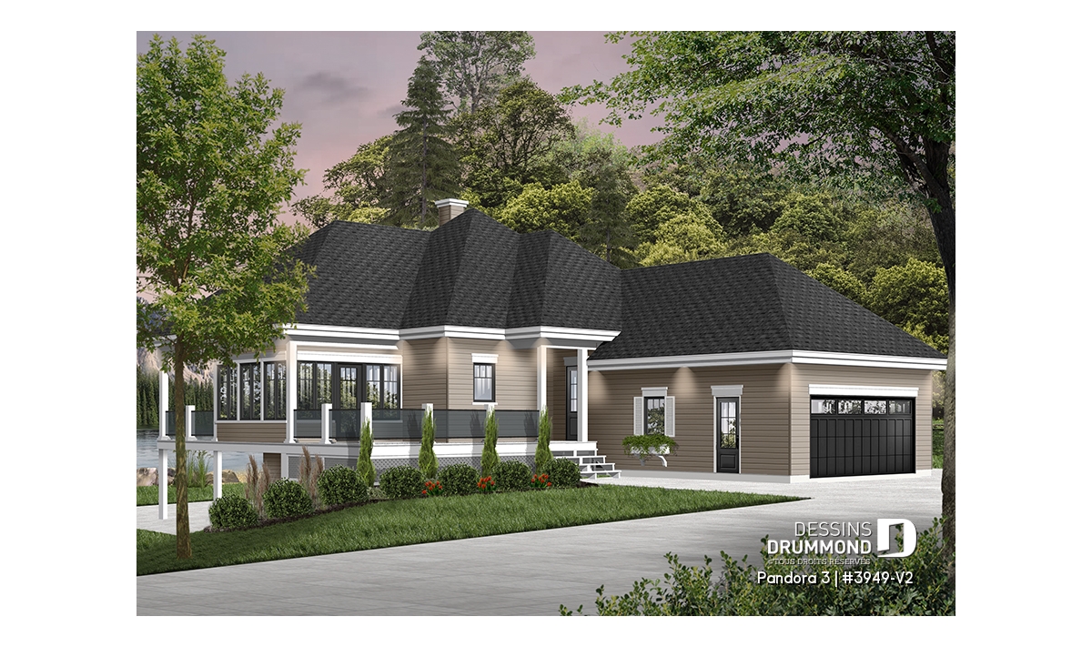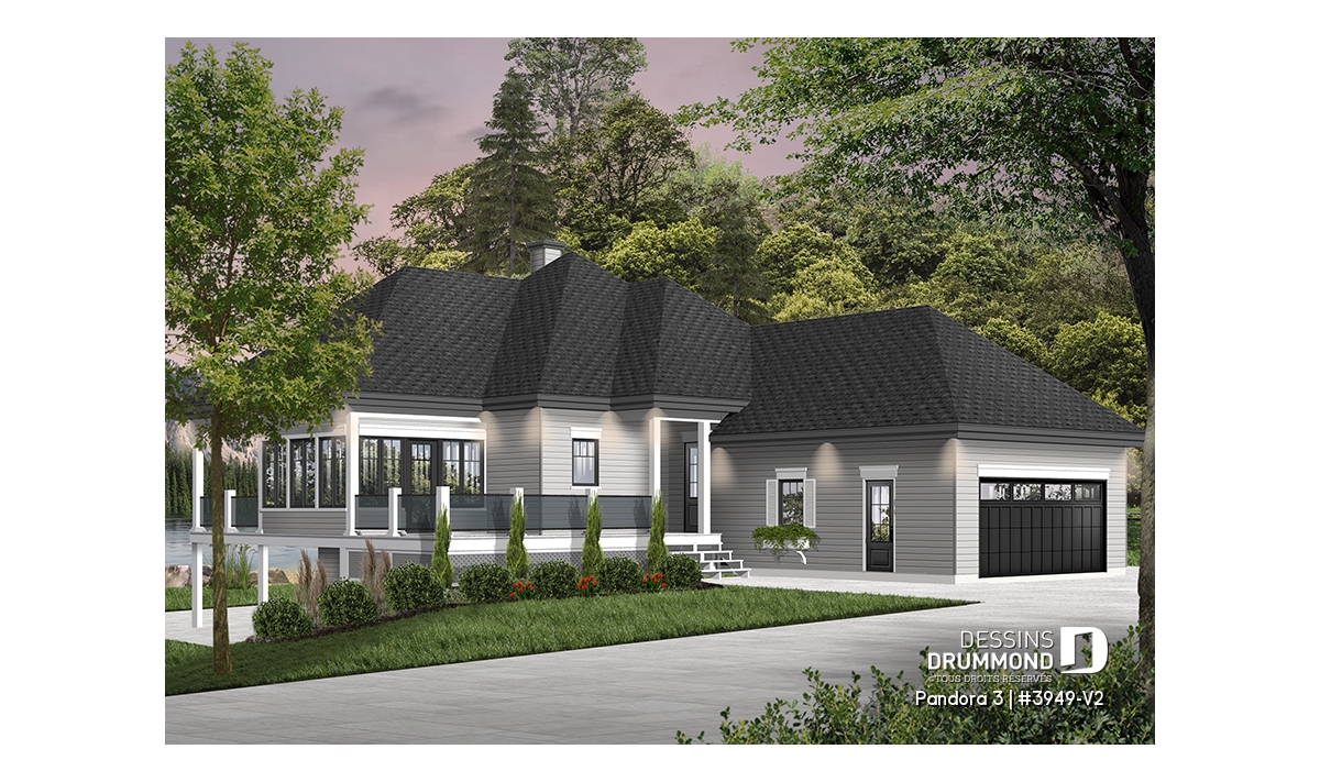 Ce modèle de chalet ou plain-pied style chalet 4-saisons propose un garage double avec accès direct à la maison, près de la cuisine. Pratique pour les retours d’épicerie!