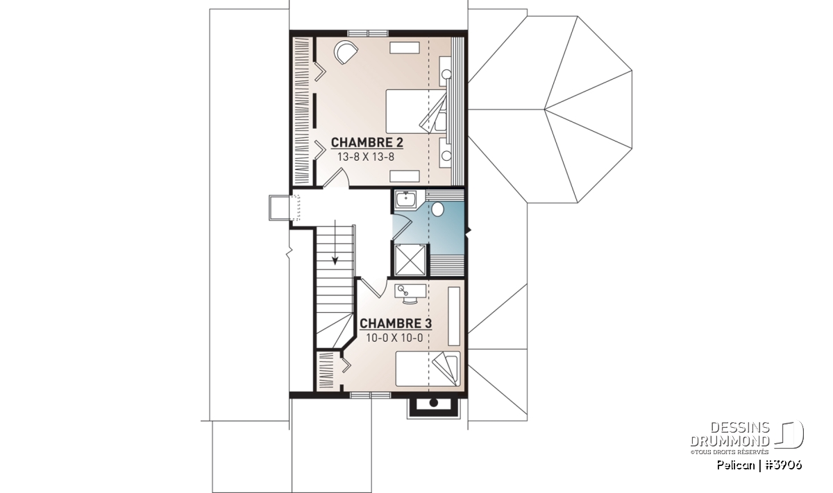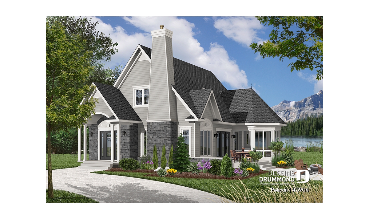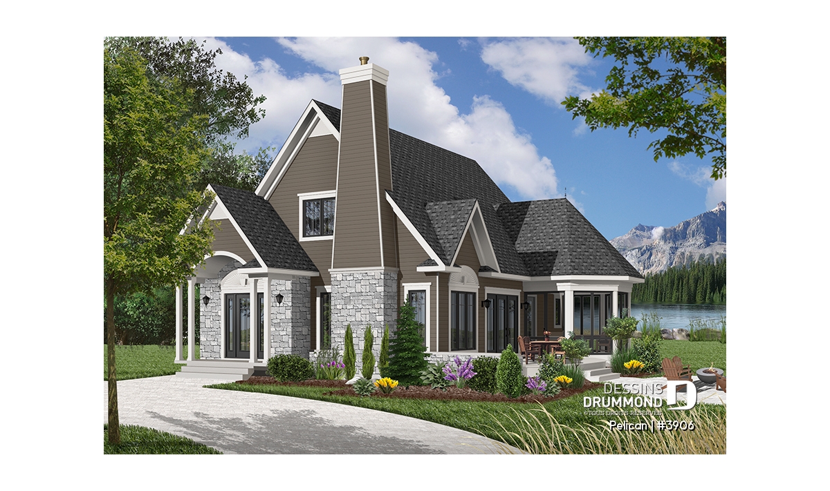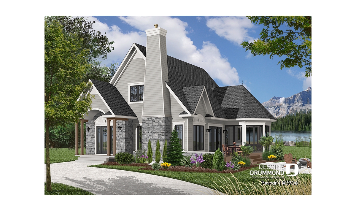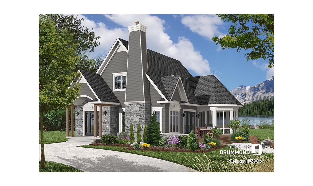 Plan de maison style chalet, 3 chambres, 2 salles de bain, vestibule fermé, salle de séjour avec foyer
