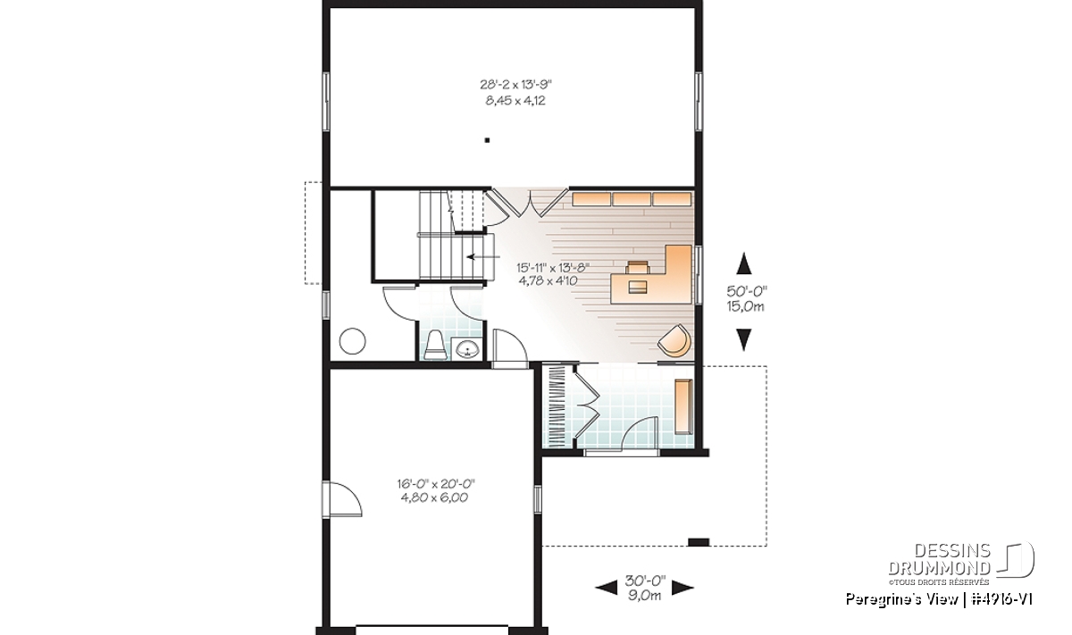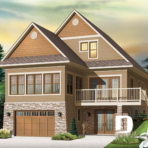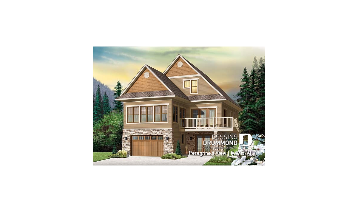 Du rez-de-chaussée l'espace familiale offre des vues panoramiques de plusieurs endroits et un bel ilot de cuisine. Le salon et la salle à manger ainsi qu'un joli solarium fenêtré sur trois côtés et un foyer à deux faces font de ce plan un endroit parfait pour terrain en pente sur une montagne ou au bord de l'eau. Une grande terrace offre l'endroit idéale pour profiter des mois chauds.